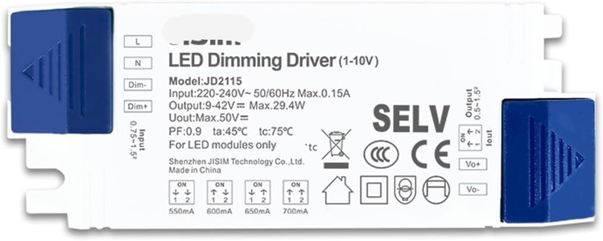 Industrial Power SupplyModel: JD2115Type: Isolated Power SupplyInput voltage: 220-240VInput frequency: 50/60Output voltage: 9-42VOutput current: 700mAPower factor: 0.9Protection: Overload protectionInstallation location: ExternalProtection level: 20Applicable lamps: track lights, downlights, spotlightsOverall dimensions (L*W*H): 115*40*28MM: 3Weight: 106Maximum output power: 30WMaximum output current: 700mASize: 115*40*28MMUnit weight: 0.12kgProduct model: JD2115Input voltage: 220-240VACOutput voltage: 9-42VDCOutput current: 550-700mA (50mA/step)Output power: 5-29.4WDimming interface: 0-10V/1-10VProduct size: 115*41*28mm (LxWxH)Applicable lamps: LED small hole tube spotlight, LED linear lamp1. Support 0-10V/1-10V dimming, and can achieve slow start effect