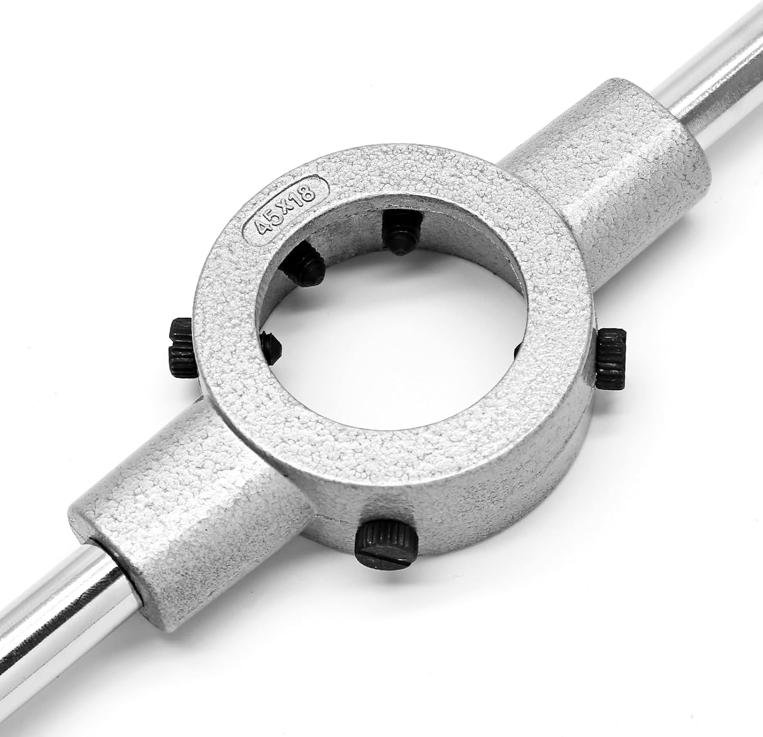 Specifications: Color: Silver Material: Tool Steel Clamping Range: M16-20 Total Length: 17.52 inches / 445mm Single-side Handle Length: 7.48 inches / 190mm. Package Content: 1 Pc Die stock handle wrench Features: 1.Product material: The product is made of high-quality tool steel, durable, will not easily deformed or damaged. The surface is treated with polished chrome plating, so that the product has the characteristics of corrosion and erosion resistance. Can be used for a long time. 2.Design features: The Round die holder has five adjustable screws that can be turned to clamp the die. The handles on both sides are threaded and can be removed for easy carrying. 3.Thread die wrench is widely used in automobile maintenance, factory manufacturing, DIY furniture projects, construction industry and so on. Warm Notices: 1. The colors may have difference as the different display, please understand. 2. Please allow 1-2mm error due to manual measurement, and make sure you do not mind before you bid.