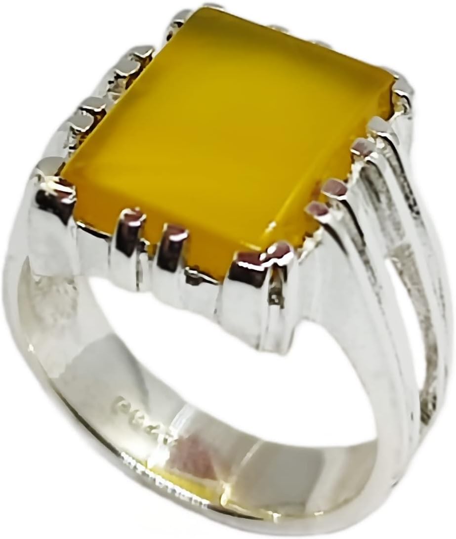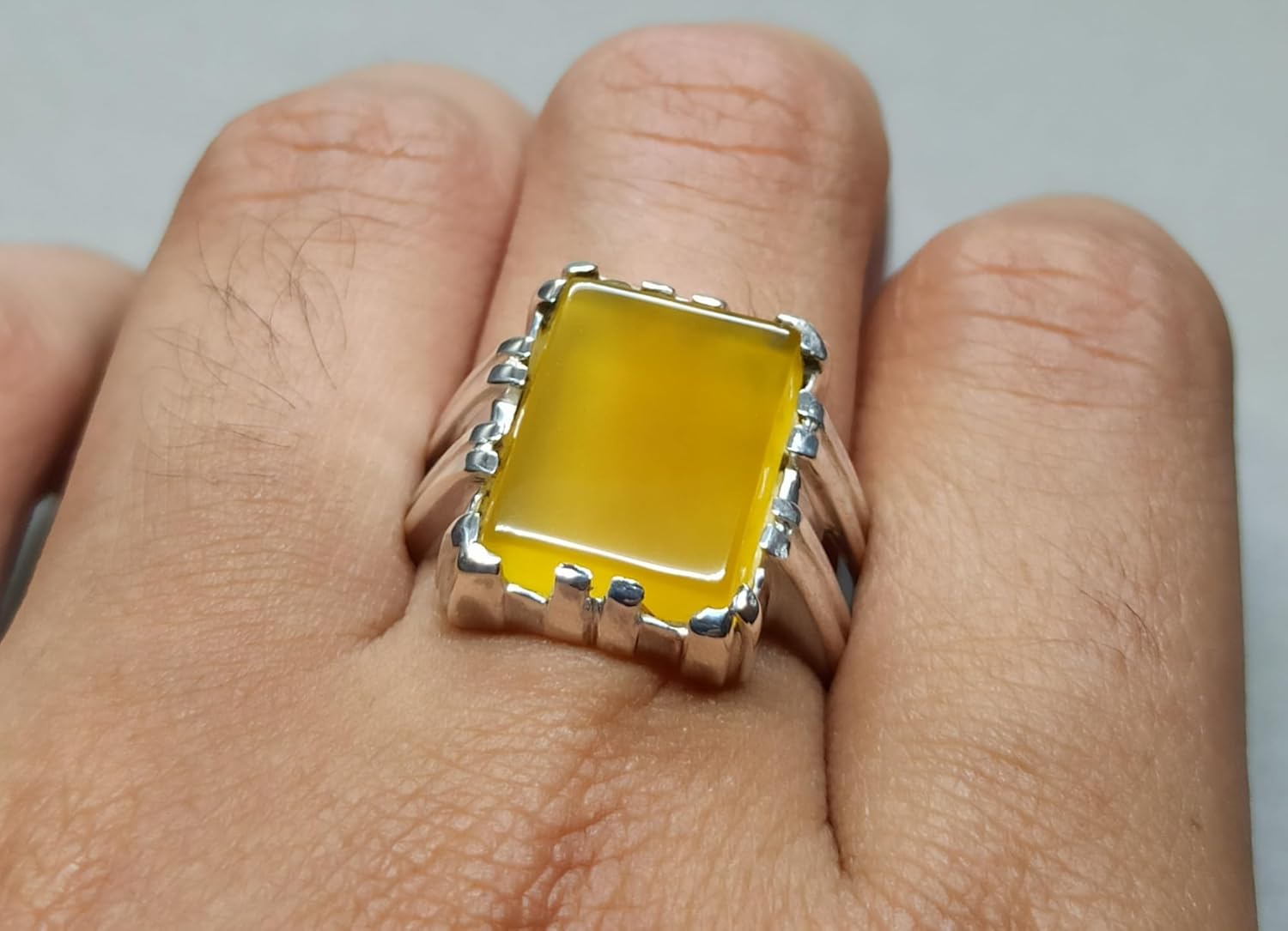 Gemstone: Agate, AqeeqGemstone Color: YellowGemstone Origin: YemeniGemstone Treatment: Natural, Unheated, and UntreatedGemstone Weight: 10 CaratGemstone Dimension: 16 x 12 x 6 mmMetal Type: Sterling Silver 925Ring Weight: 10 grams approximatelyType: Handmade This ring has natural gemstone, we cannot guarantee the gemstone texture you will receive. This ring may have a different texture as you can see in these images. But we will try to send you the approximately same as we shown in the images.Customer Policy:● Your satisfaction is our priority.● We guarantee you the quality of our products exceeds their real value.● All your questions will be answered within 12 hours or less.● In case you have any dissatisfaction please email us before feedback or case, and we will solve it immediately.● Your order will reach you with a ring box.