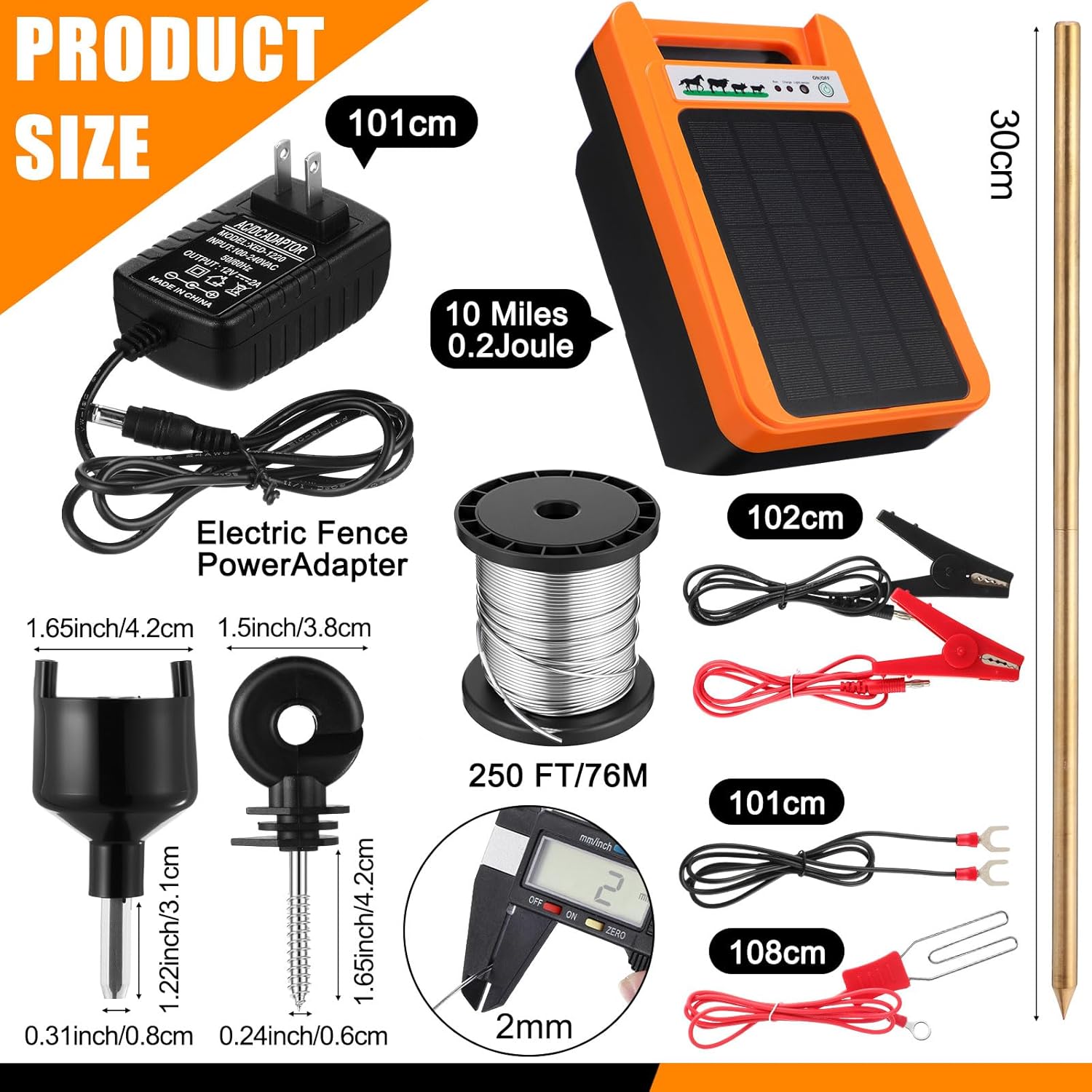 Features: Ideal choice: This electric fence charger is designed to protect your livestock and crops while repelling wildlife. Its compatibility with a wide range of soil types allows it to be applied effectively in a variety of environments, making it a versatile choice for any landowner Safe protection: Our electric fence uses pulsed shock to safely and harmlessly repel animals. This humane method protects your livestock while minimizing disturbance to wildlife. You can rest assured that your electric fence is both effective and safe for all species of interest. Specifications: Material: PP and PE combination material, Aluminum Color: blue Size: Electric fence: about 10.04 x 6.3 x 5.67 inches/ 25.5 x 16 x 14.4 cm Insulator: total length is about 3.7", width is about 1.4", self-tapping screws length is about 1.6'' Aluminum Wire: 250ft Style: US plug Package includes: 1 x Solar Electric fence charger 50 x Electric fence insulators 1 x Insulator socket tool 1 X 250ft aluminum wire 1 x Copper ground rod 1 pair crocodiles clip electric fence leads 1 pair crocodiles clip power tank cable Notes: Manual measurement, please allow slight errors on size. The color may exist a slight difference due to different screen displays
