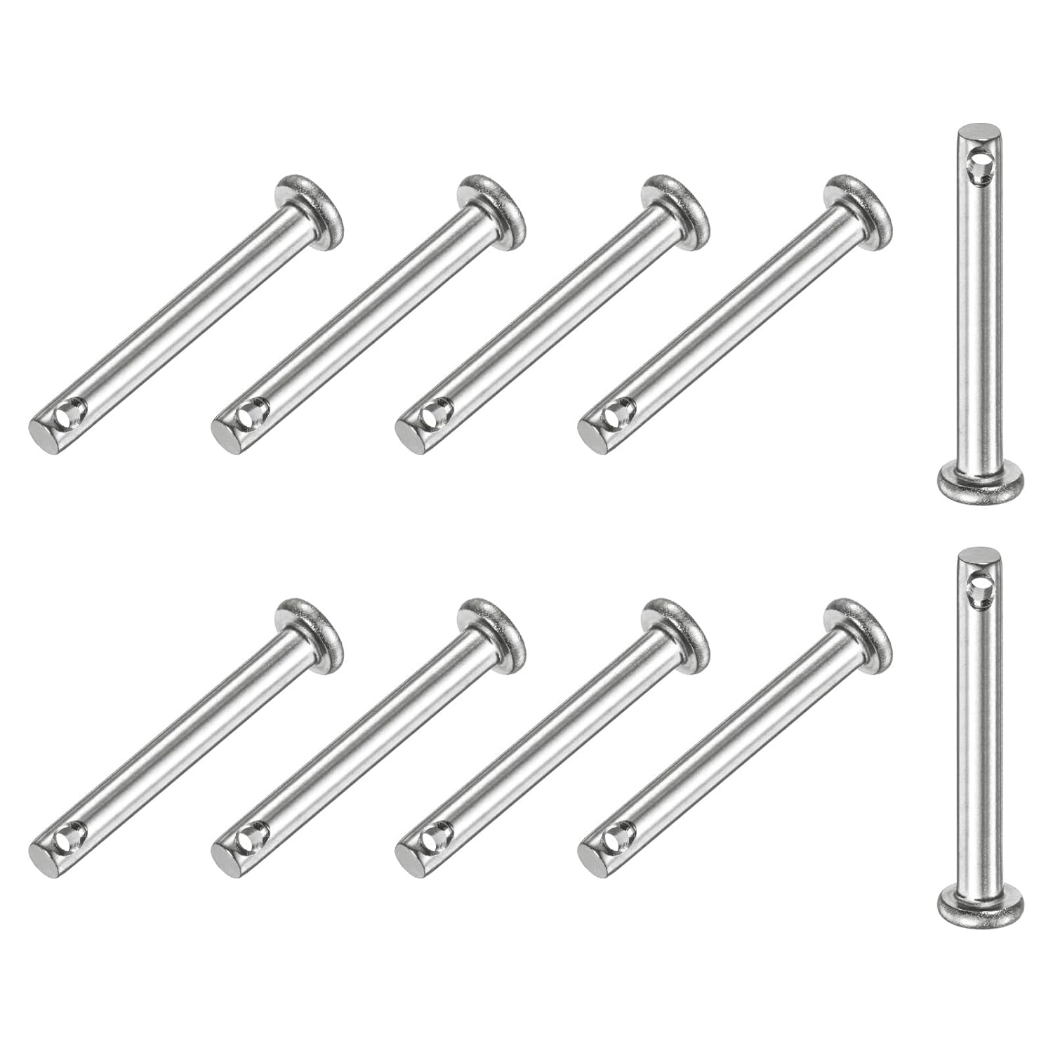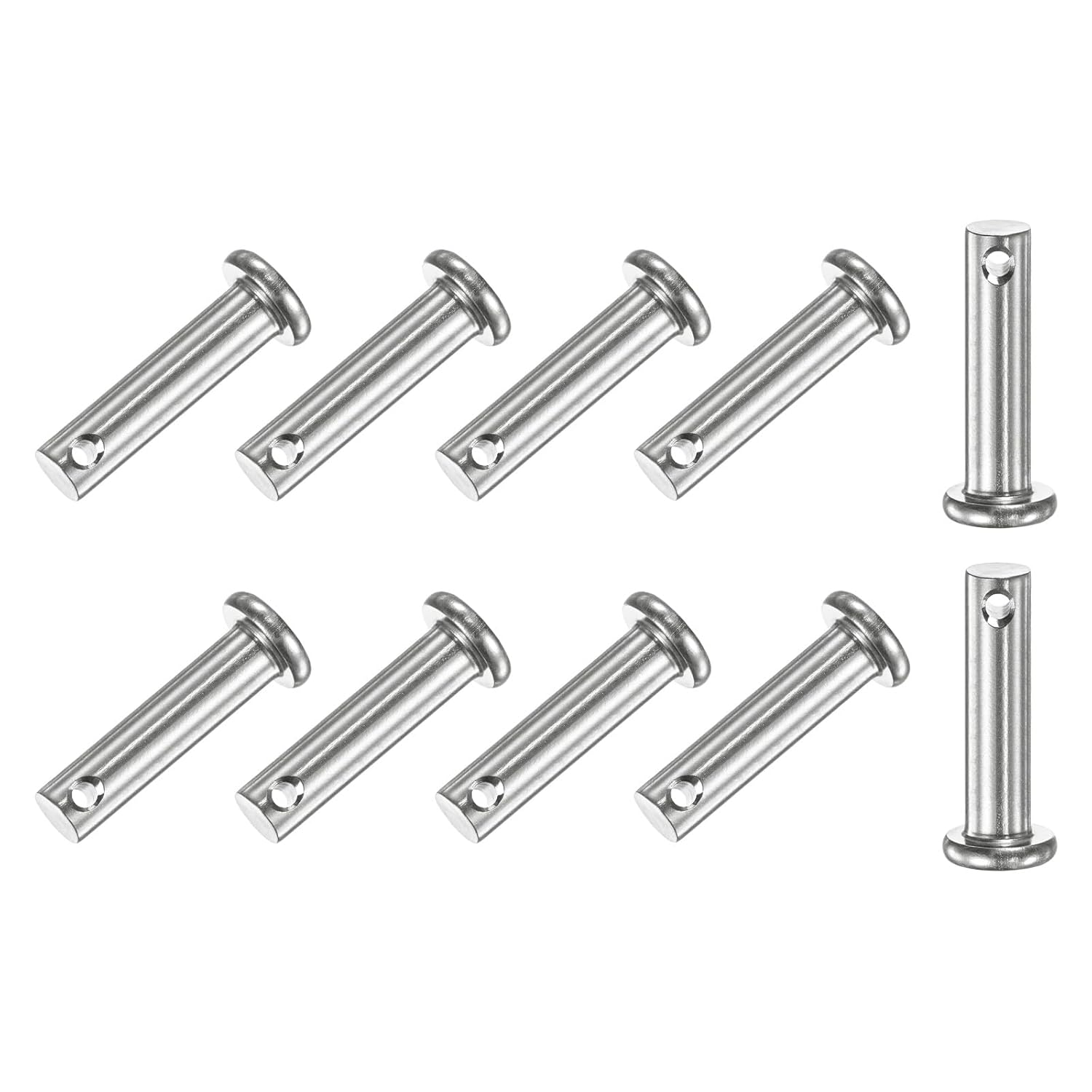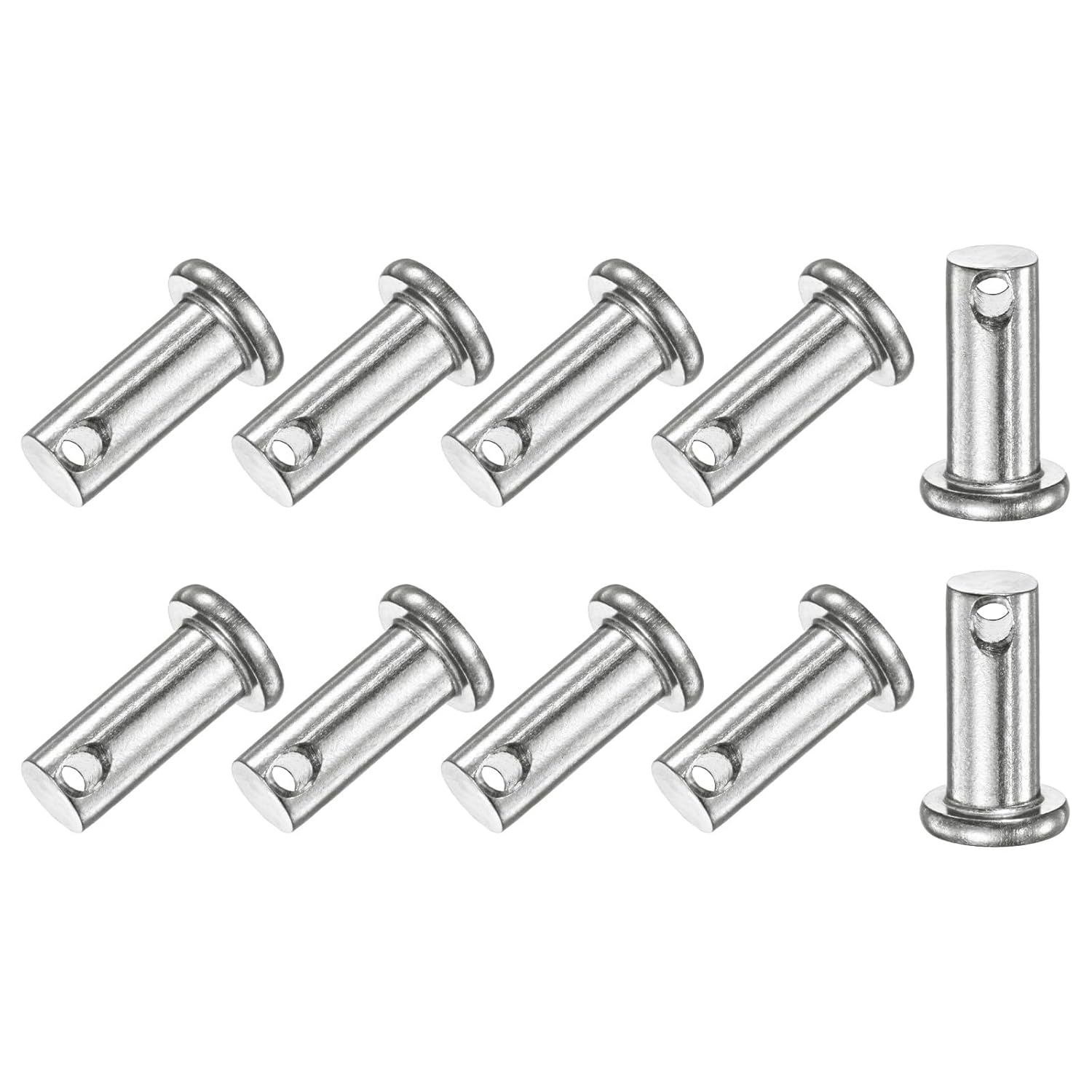 PRODUCT APPLICATIONClevis pins are used in agriculture, aviation, and construction industries, such as mechanical linkages, suspend, fastening hinges, fixing parts, rigging and lifting gear, ship rigging, furniture assembly, etc. They facilitate quick assembly and disassembly of components.PRODUCT DETAILS√ Type: Clevis Pins√ Material: 304 Stainless steel√ Rod Diameter: 0.12 inch/ 3mm√ Rod Effective Length: 0.23 inch/ 5.8mm√ Aperture: 0.06 inch/ 1.6mm√ Pin length: 0.31 inch/ 8mm√ Head Diameter: 0.19 inch/ 5mm√ Package Includes: 10 Pcs x Single Hole Clevis PinsPRODUCT ADVANTAGES1. The clamp pins are made of 304 stainless steel, which is highly resistant to corrosion and heat and has high tensile strength, hardness, and toughness. They can be fully trusted and used for a long time.2. There is a hole at the end of the chuck, through which you can pass the split pin to stabilize your accessories, and the clevis pin can absorb lateral stress and tension very well, giving your fasteners a secure fastening. INSTALLATIONInsert the clevis pin into the aligned holes, making sure it goes all the way through and is flush with the assembly, using a cotter pin or bridge pin to hold the clevis pin in place. Insert the pin into the hole on the clevis pin and bend the ends to prevent it from sliding out.