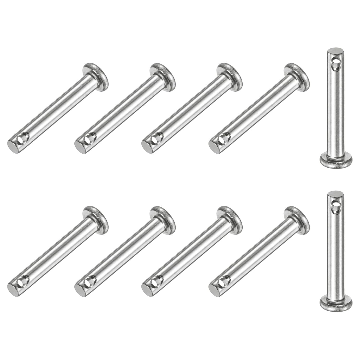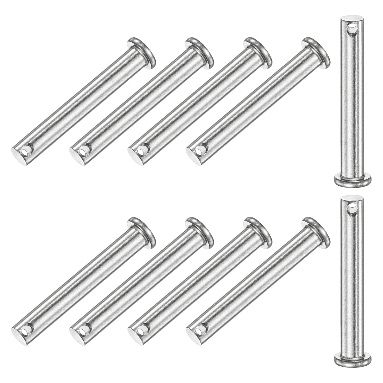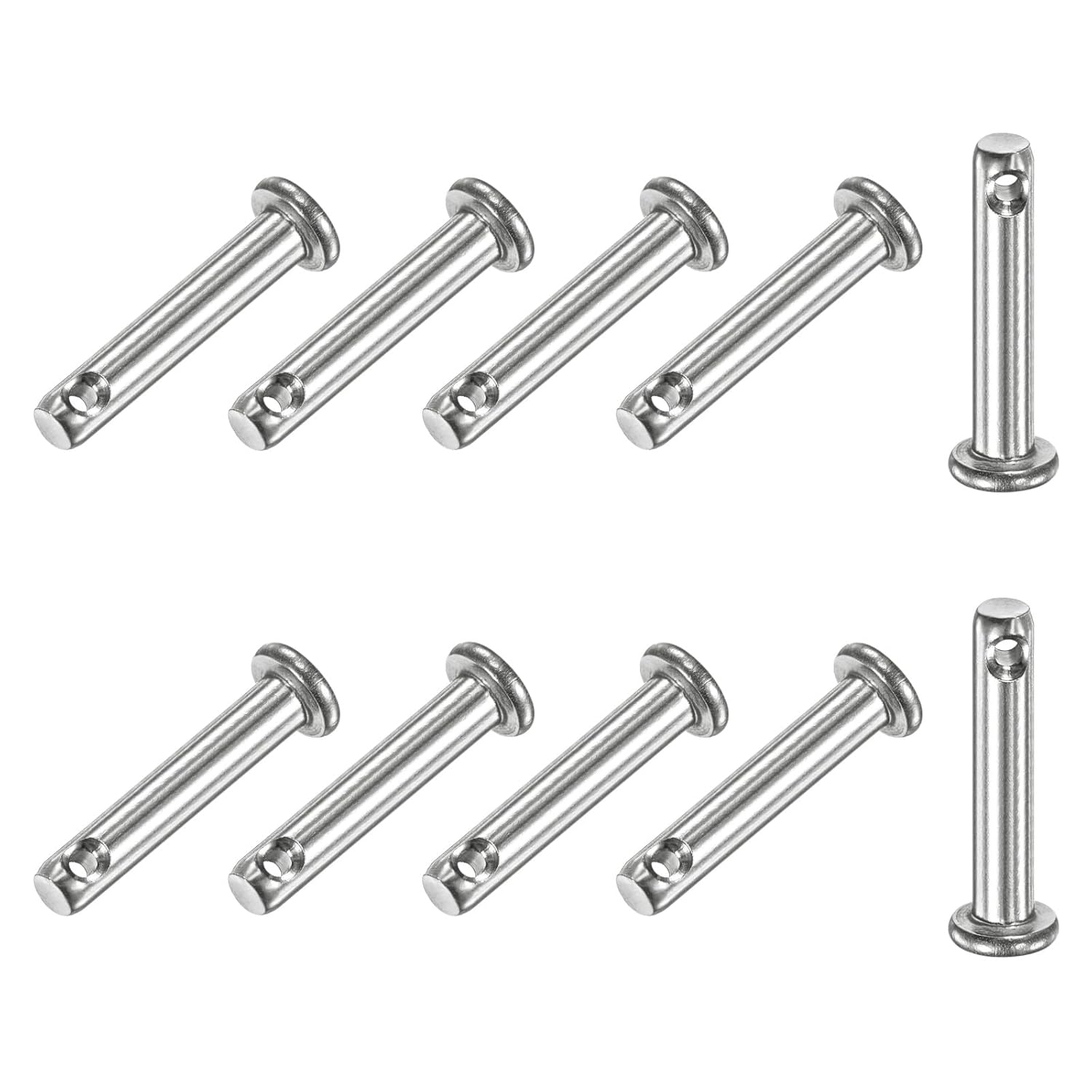 PRODUCT APPLICATIONClevis pins are used in agriculture, aviation, and construction industries, such as mechanical linkages, suspend, fastening hinges, fixing parts, rigging and lifting gear, ship rigging, furniture assembly, etc. They facilitate quick assembly and disassembly of components.PRODUCT DETAILS√ Type: Clevis Pins√ Material: 304 Stainless steel√ Rod Diameter: 0.12 inch/ 3mm√ Rod Effective Length: 0.23 inch/ 5.8mm√ Aperture: 0.06 inch/ 1.6mm√ Pin length: 0.31 inch/ 8mm√ Head Diameter: 0.19 inch/ 5mm√ Package Includes: 10 Pcs x Single Hole Clevis PinsPRODUCT ADVANTAGES1. The clamp pins are made of 304 stainless steel, which is highly resistant to corrosion and heat and has high tensile strength, hardness, and toughness. They can be fully trusted and used for a long time.2. There is a hole at the end of the chuck, through which you can pass the split pin to stabilize your accessories, and the clevis pin can absorb lateral stress and tension very well, giving your fasteners a secure fastening. INSTALLATIONInsert the clevis pin into the aligned holes, making sure it goes all the way through and is flush with the assembly, using a cotter pin or bridge pin to hold the clevis pin in place. Insert the pin into the hole on the clevis pin and bend the ends to prevent it from sliding out.