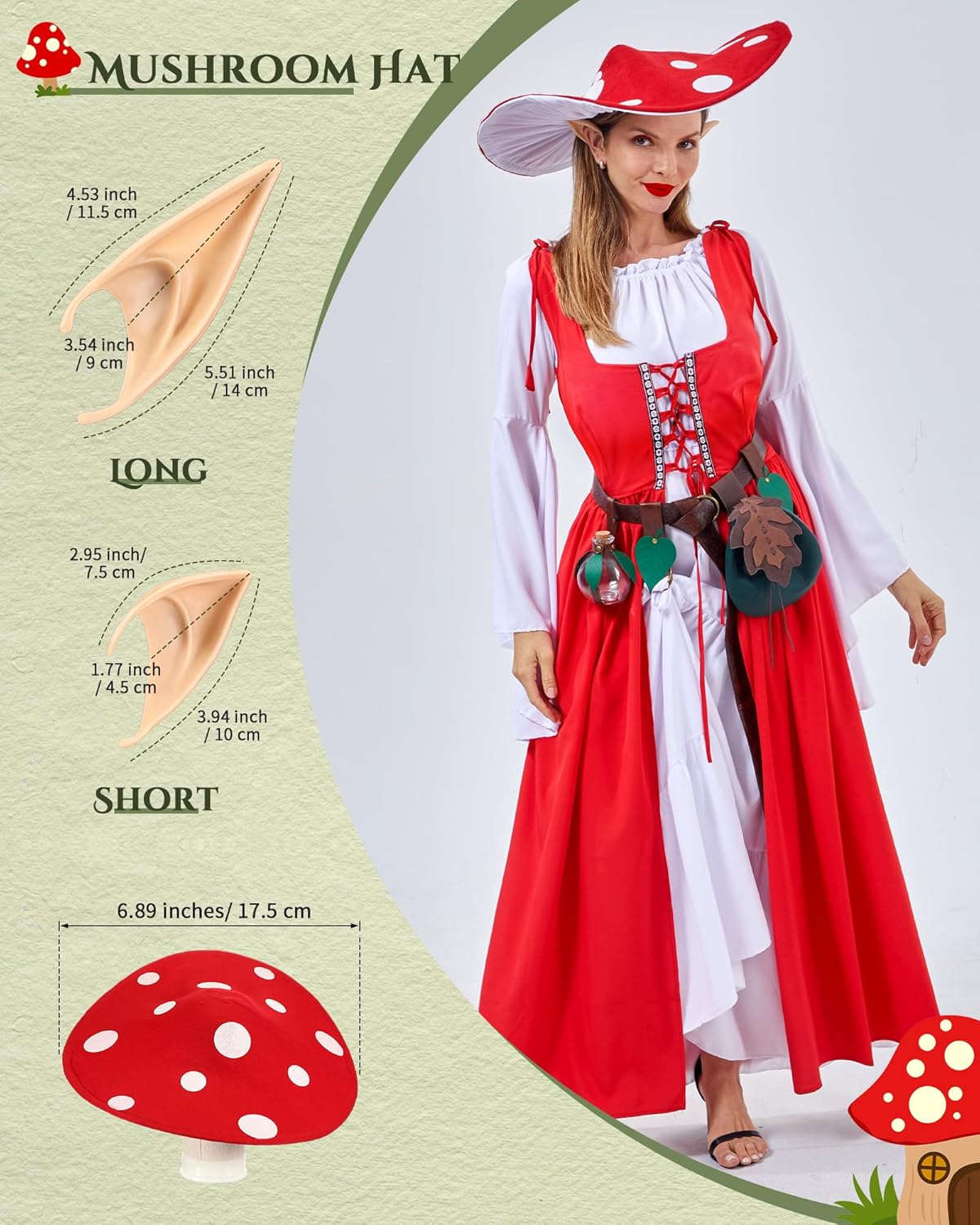 Features: Halloween mushroom hat: The mushroom hat are brightly colored, feature striking designs, and are flexible to fit any head shape. Whether you're attending a medieval-themed party, a Renaissance fair, or simply want to add a touch of whimsy to your everyday look, this mushroom hat will offer endless styling possibilities. Thoughtful Halloween gifts: This medieval renaissance dress with mushroom hat and costume accessories is a thoughtful gift for history buffs, costume enthusiasts, or anyone who appreciates unique and stylish fashion. It's sure to bring joy and excitement to the recipient on any special occasion. Specifications: Material: cotton, polyester and blends Color: main red, green and white Package includes: 1 x Two-piece medieval skirt 2 x Fairy ears 1 x Mushroom hat 1 x Medieval viking belt 2 x Leaf skirt hikes 1 x Leaf-decorated potion bottle 1 x Leaf pouch bag Notes: Manual measurement, please allow slight errors on size. The color may exist a slight difference due to different screen displays.