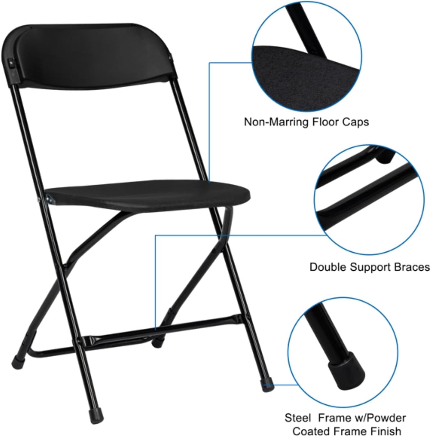 Plastic folding chairs are perfect for gatherings, parties, homes, offices, churches, schools, picnics. Made of heavy-duty plastic material and powder-coated metal material. The chairs can bear up to 350 pounds. The plastic chairs are lightweight, so we can move them effortlessly. Specifications: 1. Material: PP iron 2. Color: Black 3. Weight: 71.6 lbs / 32.5 kg (1 set of 10) 4. Size: (17.72 x 18.9 x 31.5) inches / (45 X 48 X 80) cm 5. Weight capacity: 350 lbs
