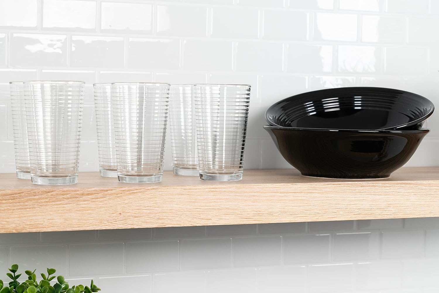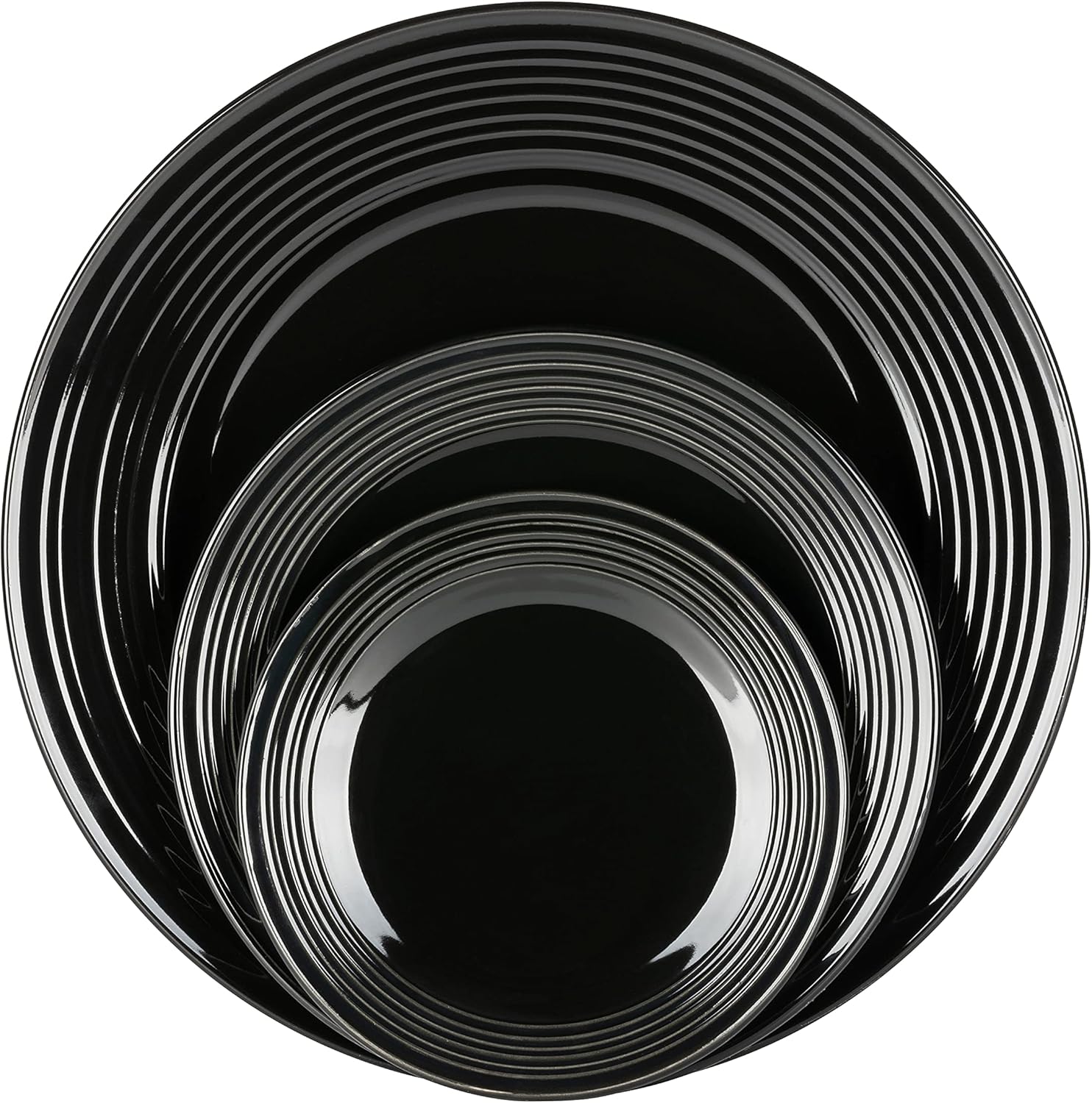 Fully stock your kitchen with this casual entertaining set. Utilitarian and practical this complete dinnerware set includes service for six plus glass tumblers, flatware, and two serving bowls. The deep black-colored stoneware pieces are made with a ringed rim design and can be used in the microwave, dishwasher, and oven.