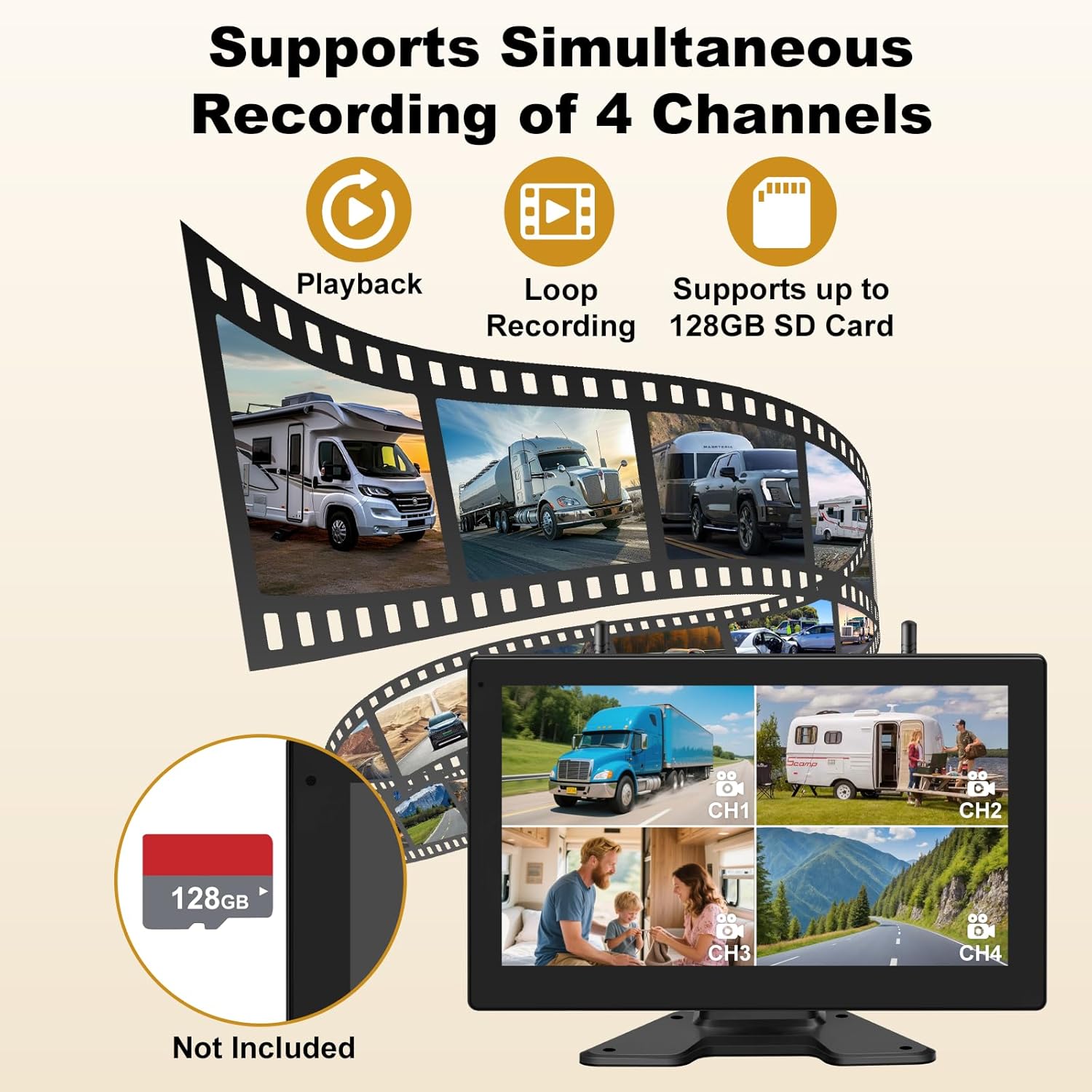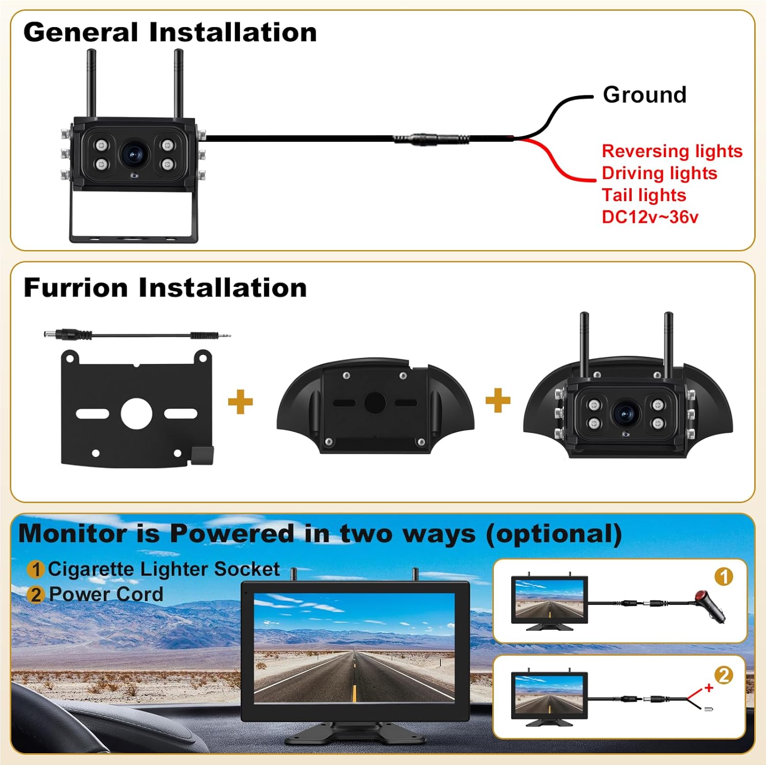 | BuiltIn Media | 10 Inch Monitor*1, 1080P Wireless Backup Camera*2, Car Charger*1; Power Cord*3, Furrion Adapter, User Manual; Installation Kit |