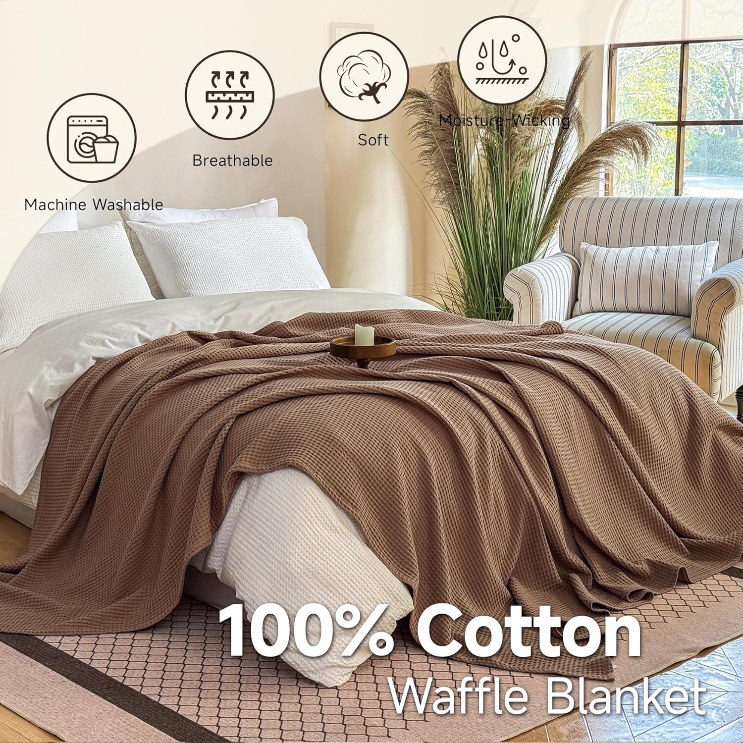 Indulge in Year-Round ComfortSay goodbye to bulky winter blankets and thin summer sheets. Our innovative waffle weave design is the secret to its all-season versatility. The signature pockets of air created by the weave act as natural temperature regulators. They provide gentle warmth when it's cool and allow breathability when it's warm, ensuring you are always at a comfortable temperature. Whether you're curled up with a book on a chilly evening or needing a light cover on a breezy summer night, this blanket adapts to you.Uncompromising Quality from Fiber to FinishWe believe comfort starts with the right materials. That's why we use only 100% premium natural cotton. This choice results in a blanket that is not only incredibly soft to the touch but also highly absorbent and moisture-wicking, keeping you dry and comfortable. It’s an excellent choice for anyone with sensitive skin and is a hypoallergenic bedding option for the whole family.Your Go-To Blanket for Every OccasionIts versatility is unmatched. Available in five sizes: 40"x50", 50"x60", Twin(66"x90"), Queen(90"x90")and King Size(104"x90").Lounging: Draping over your sofa as a stylish throw blanket.Sleeping: Using as a top layer on your bed or a lightweight bedspread.Traveling: Folding compactly for use in hotels, camping, or on planes.Gifting: Making a thoughtful and practical gift for housewarmings, holidays, or anyone who deserves a touch of comfort.Effortless Care for Lasting EnjoymentWe know you'll love using this blanket every day, so we made sure it's incredibly easy to care for. Simply machine wash cold on a gentle cycle and tumble dry on low. Its high-quality construction ensures it resists pilling and fading, maintaining its beautiful texture and vibrant color wash after wash.