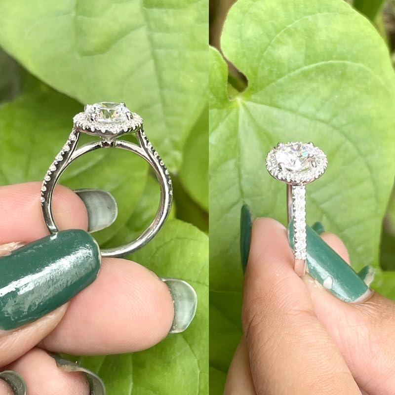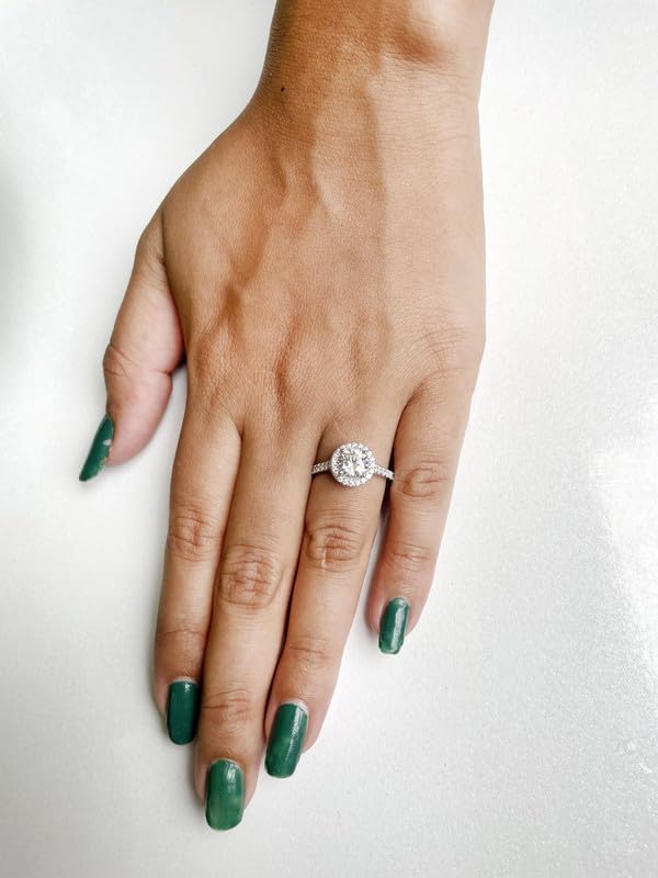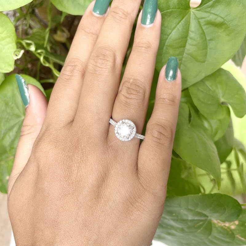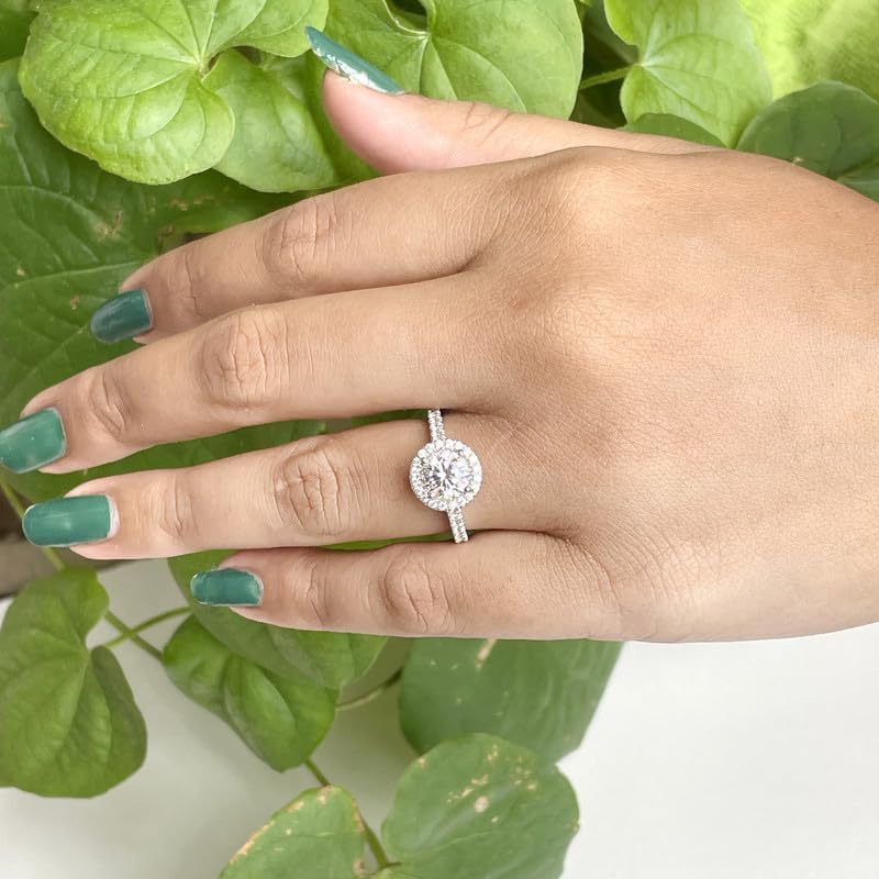 This Halo Engagament Ring Crafted in 925 Sterling Silver, available in 14K White, Yellow and Rose Gold Plating. Round Cut GRA Certified Moissanite set in Prong setting.