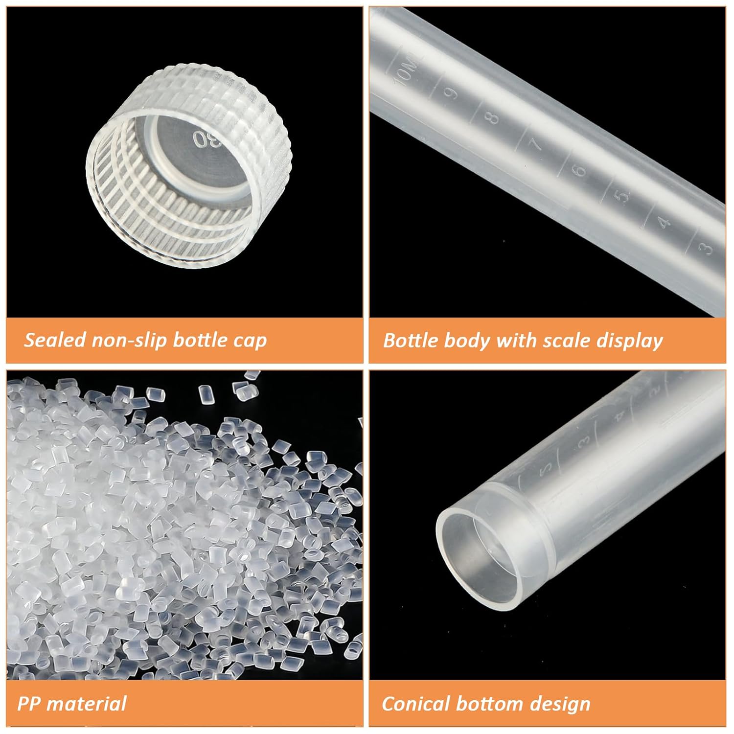 LOPYXBR 10 ml plastic test tubes with caps 10ml are made of high-quality clear plastic and are durable. Smooth surface and good transparency, low-temperature resistant and reusable Specification Size: Height: 3.8 inch/ 95.5 mm Outer Diameter: 0.6 inch/ 15.3 mm Capacity: 10 ml Color: Transparent Materials: Plastic Package included 100 PCS 10 ml frozen plastic vials with caps 10ml Feature Transparent small tubes with caps are suitable for various liquid solids, such as essential oils, spices, dyes, model paints, etc With a good sealing cap, samples will not volatilize, smooth surfaces and good transparency, and have resistance to low temperatures, frozen plastic vials with caps 10ml can frost for a long time Our 10ml plastic test tubes with caps 10ml come with a precise scale for you to measure liquids
