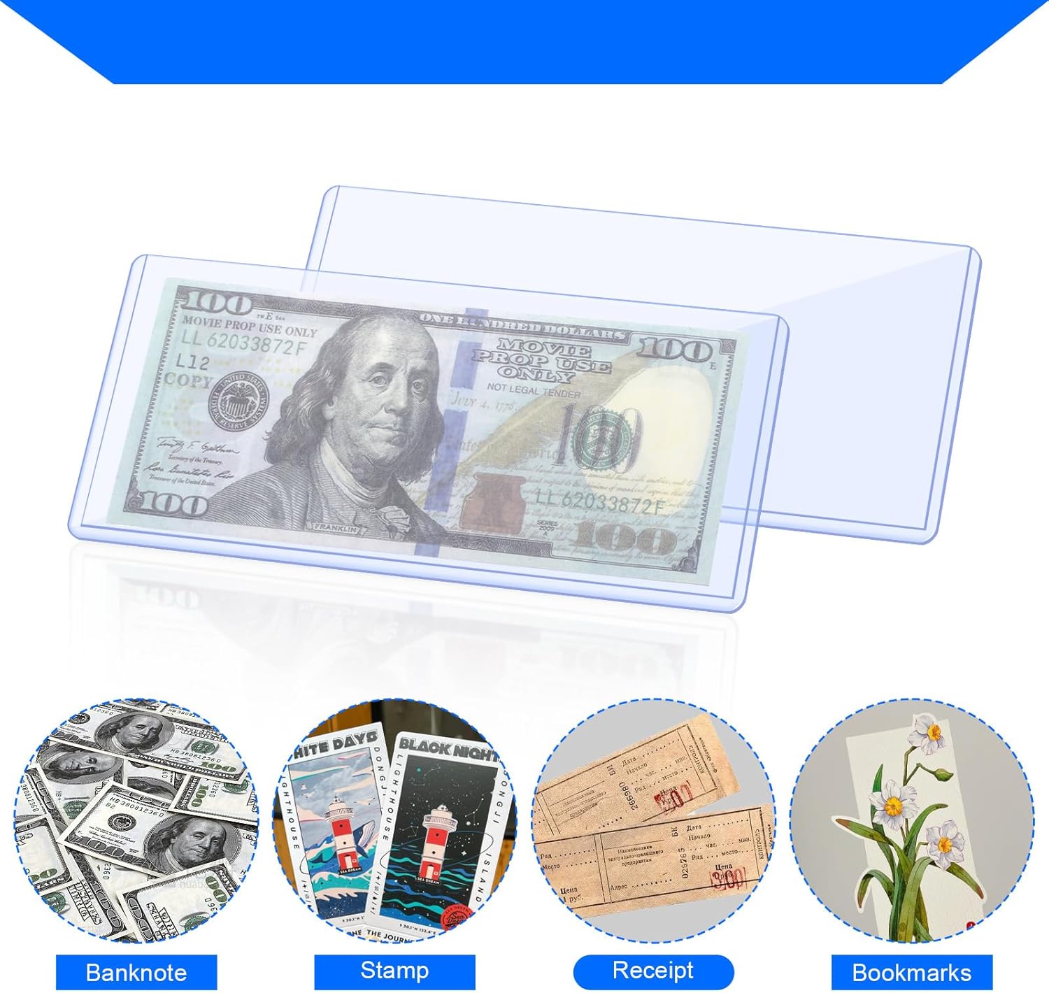 ----------------- WELCOME TO OUR SHOP -----------------Packing List: 100 PCS Dollar Bill SleevesSpecificationSize: 6.8 x 2.9 InchesColor: ClearMaterial: PVC