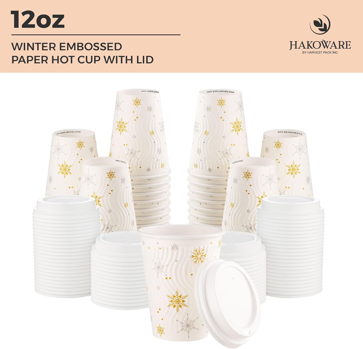 [100 SET]Harvest Pack 12 oz Christmas Coffee Cups with Lids, White Snowflake Winter Disposable Paper Cups, Insulated Ripple Wall Hot Cups, XMAS Gold and Silver Foil, Hot Chocolate To go