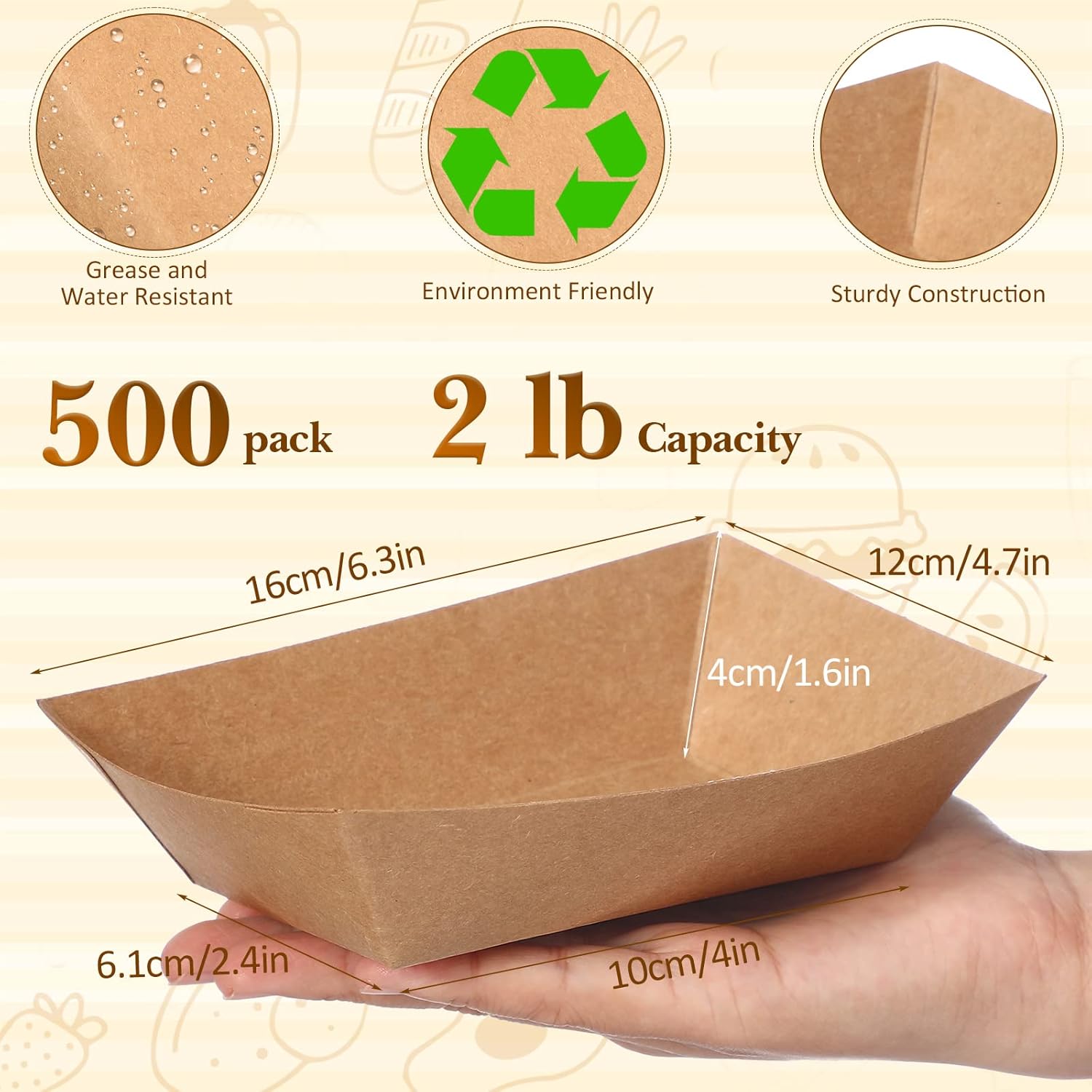 | Included Components | 500 x Brown disposable paper food serving trays, 500 x Deli wax paper sheets for food |