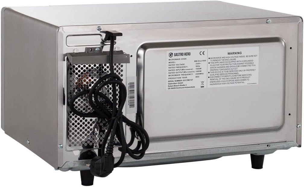 The premium ECO 1000 W microwave, crafted entirely from high-quality stainless steel, is exceptionally durable. It features an LED display, multiple power levels, and is perfect for commercial kitchens, restaurants, and fast-food establishments.