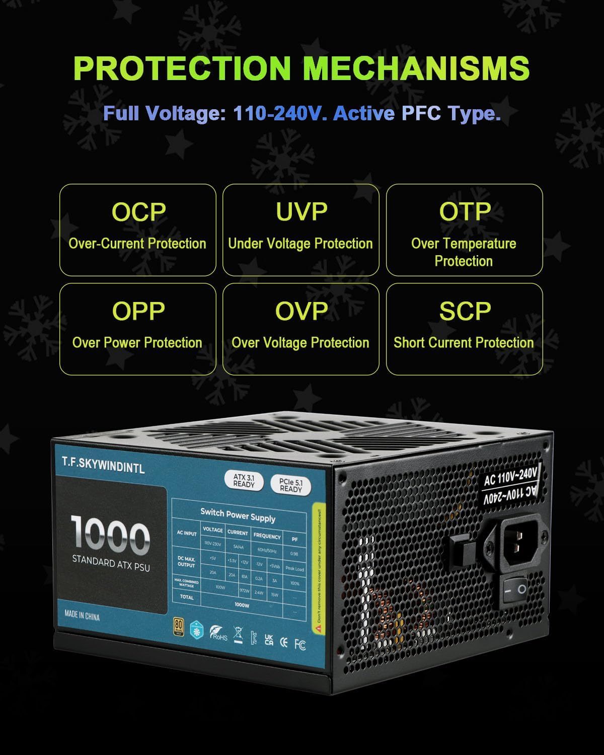 • 1000W Power Supply 80 PLUS Gold – This 1000w psu delivers up to 90% energy efficiency under typical loads, outperforming standard pc power supply models by cutting energy waste and lowering electricity costs. Equipped with active PFC, the power supply 1000w ensures consistent voltage regulation for reliable performance across gaming, server, and high-demand tasks.