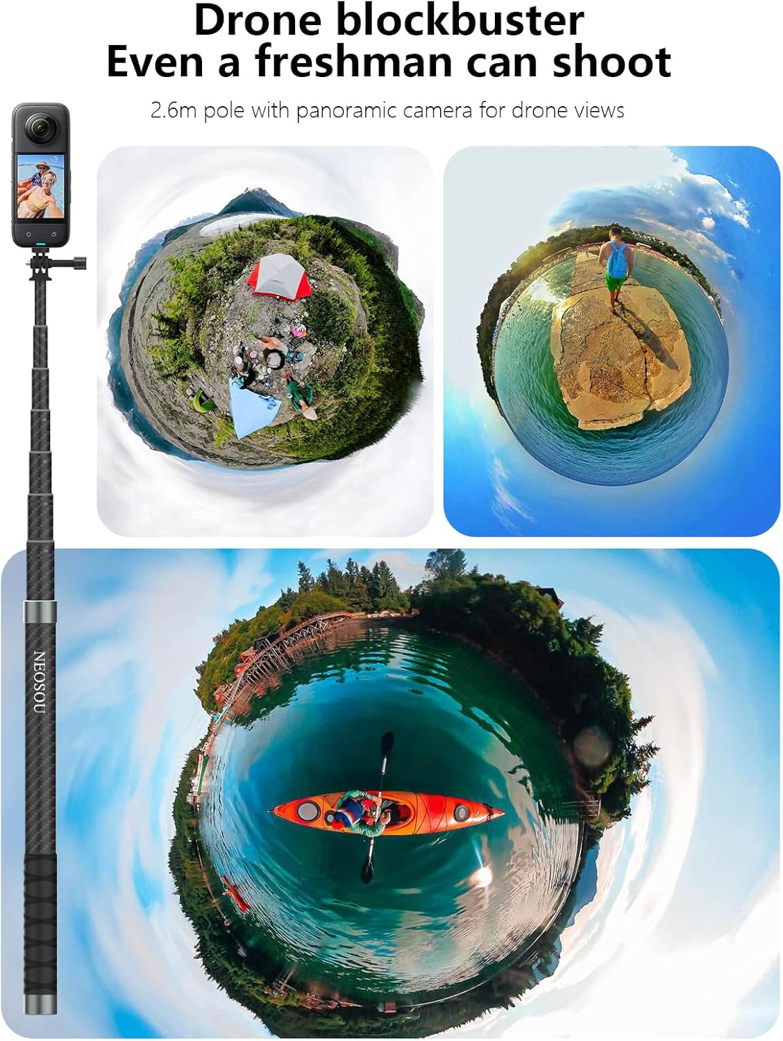 NEOSOU 2.6M/102" Ultra Long Carbon Fiber Selfie Stick Pole Waterproof Lightweight for Action Cameras === Extend. Shoot. Dominate Every Adventure === Compatible for GOPRO HERO 13 12 11 10 9 8 7 6 5 series, DJI Action 5/4/3, Osmo Pocket 3, Insta360 X4/X3/GO 3S/Ace Pro 2, and more sport wearable camera. Weighing just 9.88oz/280g, this ultra-light carbon fiber pole stretches from 16.93" to 102.36" in seconds, surviving well in rain, snow, and saltwater condition. ________________________________________ 📦 What’s Included: ◆ 1x 102" Long Carbon Fiber Selfie Stick ◆ 2x Mount Adapters (for GoPro & Insta360 use) ◆ 1x Anti-Loss Wrist Strap ◆ 1x Water-Resistant Carry Pouch ◆ User Manual ________________________________________ === Why This is Your Ultimate Action Companion === ◆ High-Grade Pure Carbon Fiber Body ✓ 100% Rustproof – Saltwater-safe for surfing/diving ✓ 3x Stronger than aluminum poles, yet 30% lighter ✓ -30°C to 40°C temperature resistant ◆ Instant Length Control (16.93" to 102") ✓ Telescoping Lock System – Adjust mid-action with one hand ✓ Pro Tip: Rotate clockwise to lock – arrows guide you! ◆ For GoPro/DJI/Insta360 Universal Fit ✓ 2 Adapters Cover 99% Cameras: GoPro HERO 5-13, MAX, Mini DJI Action 3/4/5 Pro, Osmo Pocket 3 Insta360 X3/X4, GO 3S, Ace Pro 2 ◆ Tripod Hub + Secure Grip ✓ 1/4" Thread – Attach to tripods (tripod not included) ✓ Anti-Slip Strap – Double-layer lock prevents drops ◆ Pack Light, Shoot Big ✓ Fits in Jeans Pockets – Collapses to 13"/33cm ✓ 280g Weight – Lighter than smartphones ________________________________________ === Built for Extreme Scenarios === ✓ Surfing – Saltwater-proof grip ✓ Skiing – Glove-friendly twist locks ✓ Vlogging – Tripod mode for hands-free filming ✓ Travel – TSA-friendly compact design ________________________________________ ⚠️ Notes: For underwater use, ensure camera housing is securely attached. Avoid overtightening adapters – finger-tighten only. 🔒 1-Year Warranty: Contact us for free replacements if locks loosen or adapters wear out.