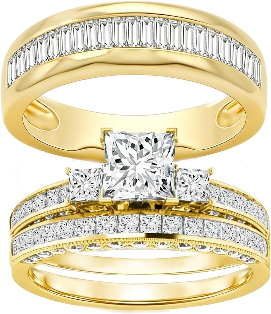 10K 14K 18K Gold Couple Ring Set for Her and Him 1-3 Carat Moissanite Matching Wedding Bands Ring Set for Women and Men Couple Engagement Rings Sets 925 Silver 3pcs Bridal Rings Sets Free Engraving