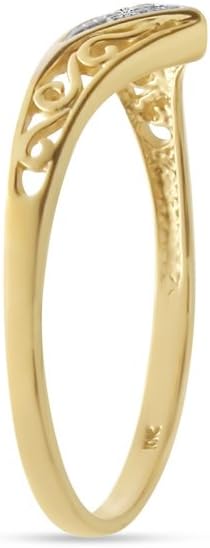 This 10K Yellow Gold Diamond Chevron Ring has a delicate filigree designed band accented with a cluster of diamonds, giving a classic look a more modern twist.Diamonds Dazzle: The most precious gemstone, the diamond is a dazzling choice all year long, be it for anniversaries, special milestones, holidays or April birthdays. As the birthstone of April, the diamond is an extravagant option.Give as a Gift: Made from genuine, high quality gold and gemstones, this fine jewelry makes an excellent gift, perfect for birthdays, as a romantic anniversary gift, holiday gift, or for a special occasion. Help a loved one celebrate a special milestone, whether it is sweet sixteen, prom, graduation, a new job or a new baby, the right piece of fine jewelry can enhance any moment! Meaningful Beauty: The right piece of jewelry will allow you to create elegant, sophisticated looks for formal events, or add a luxurious element to your day to day or business wear. But you can also use fine jewelry to add some symbolic meaning to a look or gift choice, choosing gem that aligns with a birthstone, Zodiac sign or even the day of the week a person was born! Alternately, choose a flattering or favorite color gemstone. General Care: Preserve your fine jewelry and keep it looking its best with proper storage and cleaning. Store jewelry in a clean, dry place and inspect your jewelry at least once a year for loose prongs, worn mountings and general wear and tear. Avoid using harmful chemicals, makeup and hair products as these can damage your jewelry. A professional cleaning is advised one per year to help maintain these cherished items.
