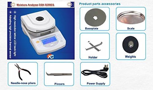 V.In the process of test ,the dry state can be directly confirmed to speculate the finish time. VI.It is equipped with automatic peeling function ,it can measure immediately and continuously, and also measure accurately through the zero drift correction. VII.Installed with RS232 interface inside, the products can be directly connected to computer and printers etc. VIII.The halogen drying method moisture analyzer can test the free water content of chemical raw materials ,grain, mineral, biological product, food, pharmaceutical raw materials, paper, textile raw materials and etc. Technical Data Voltage:220 V/110V Capacity:10g Readability: 10mg Repeatability(3g samples):0.5% Min sample amount: 0.5 Advised sample amount:3-10g Heat up time:1-99 minutes,1 minute interval Temperature program: standard Terminal control: timing, automatic Interface:RS232 Heating temperature range:50-180℃ Showing content:moisture%, solid %, weight, time ,data,etc Heating source:halogen lamp Pan size:100mm Dimension: 265*160*150 Net weight: 5kg
