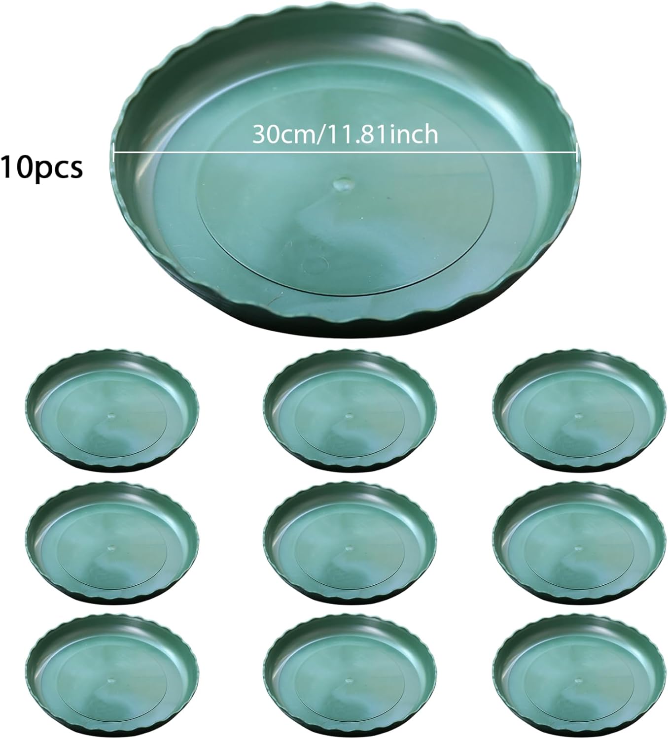 Description: Flower Pot Drip Trays measure up to 12 inches in diameter and can accommodate most sizes of pots, and our drip trays are fully covered to catch excess water and prevent spills.Plant Trays for Pots are made of thick, heavy-duty plastic that can withstand the weight of a variety of sizes of pots and are resistant to wear and tear.Plant Water Catcher Trays are suitable for both indoor and outdoor gardening. It protects your floors and surfaces from water damage and soil while keeping your garden space neat and organised. Features:. Plant Saucer. -Color: Green. -Material: Plastic. -Size: Diameter 30cm/11.81 inch. Note: Manual measurement, please allow slight errors on size. The colors may exist slight difference due to different screens. Package Including 10 * Plant Saucer