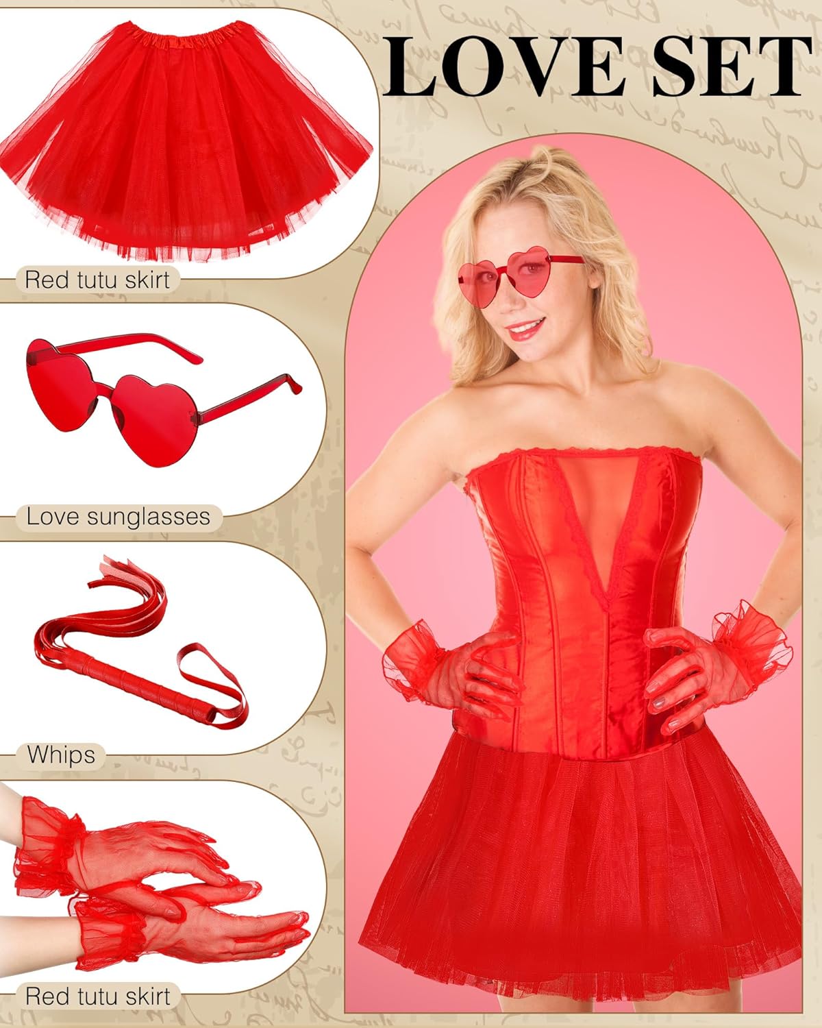| Included Components | Tutu dress, Red lace gloves, Heart glasses, Red whip, Bouquet, White gloves, White veil, Prop knife, Black gloves |