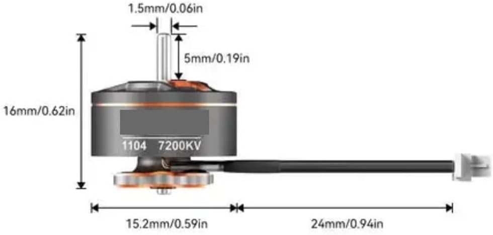 SpecificationItems: Series 1104 | 7200KV Brushless MotorsMaximum Power: 122.5WMaximum Current: 10.2AWeight: 5.3gShaft Diameter: ø1.5mmShaft Length: 5mmWire Specification: 28AWGWire Length: 24/80mmMotor Mounting Hole Size: 4*M2 Ø9mmPropeller Mounting Hole Size: 4*M2 Ø5mmPackage1 * Series 1104 | 7200KV Brushless Motors4 * M2 * 4 Hex Flat Head Screw4 * M2 * 5 Hex Flat Head Screw