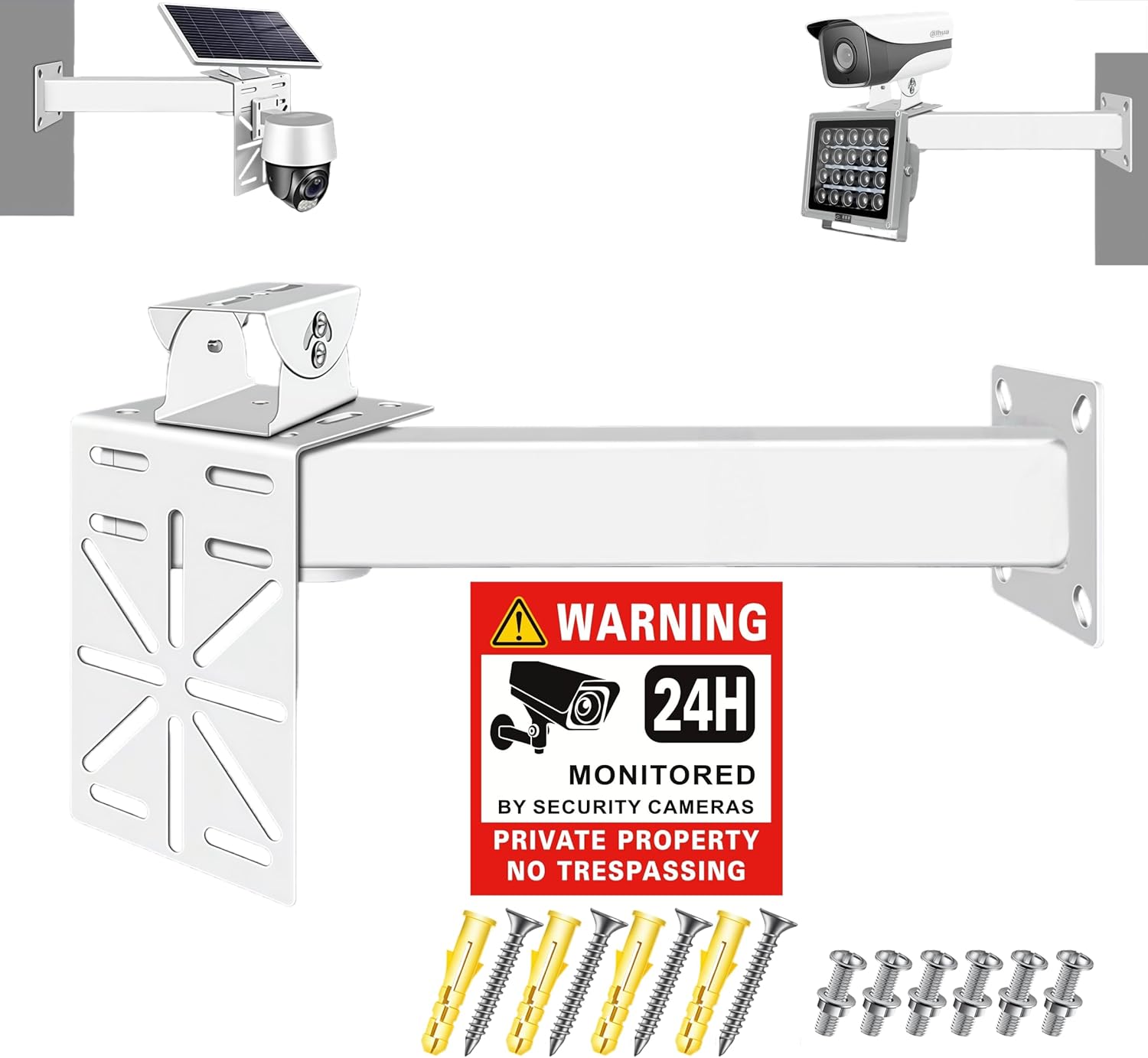 Description Universal 30cm Security Camera Pole Mount: Your All-Weather, All-Solution Bracket Tired of camera mounts that only fit one type of camera? Frustrated by messy wiring for outdoor solar panels? Struggling to mount your camera to a tree or pole without custom hardware? Our 30cm Heavy-Duty Pipe Mount solves all these problems. Designed for homeowners, contractors, and small business owners, it combines universal compatibility, solar-ready functionality, and multi-surface mounting to create the ultimate outdoor security solution. Core Features That Set Us Apart Dual Camera Compatibility: Switch between bullet cameras (goose neck) and dome/PTZ cameras (L adapter plate) in seconds, no extra tools needed. Solar Panel Integration:Mount your camera and solar panel together for continuous, wire-free power—perfect for remote locations where outlets aren’t available. Multi-Surface Mounting: The included stainless steel clamps and zip ties let you attach the bracket to poles, trees, fences, or walls, making it ideal for farms, job sites, and rural properties. Rugged Outdoor Durability: The 40mm steel pipe and UV-resistant coating ensure your mount stays strong through rain, snow, and harsh sunlight, while the rust-proof finish prevents corrosion in coastal areas. Tool-Free Angle Adjustment: The goose neck joint lets you reposition your camera anytime, even after installation, so you can adapt to changing security needs without re-drilling. What’s in the Box? 1 × 30cm (11.81in) Heavy-Duty Pipe Mount (40mm (1.57in) diameter) 1 × 80x50x48mm (3.15x1.97x1.89in) Goose Neck Bracket 1 × 155x120x100mm (6.10x4.72x3.94in) L Adapter Plate 2 × 200mm (7.87in) Stainless Steel Hose Clamps 2 × 300mm (11.81in) Black Zip Ties 1 × Complete Mounting Screw & Washer Kit