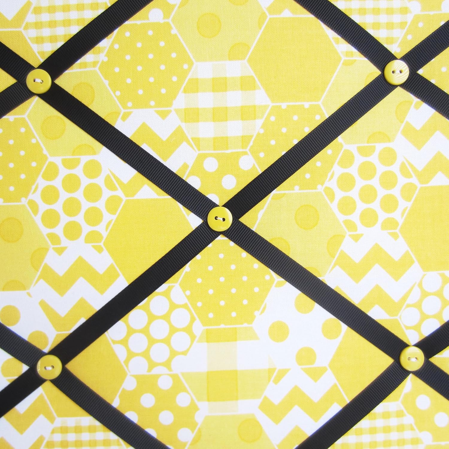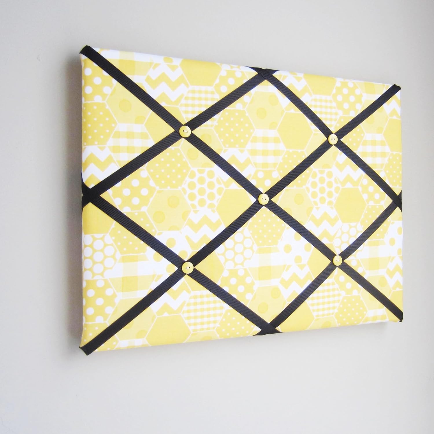This 11"x14" memory board is covered in a yellow & white geometric print fabric. The ribbon is black grosgrain. The buttons are yellow. This Handmade fabric memory boards are designed to be used without tacks or push pins. Great for: *Organizing photographs (your own or all those Christmas photo cards!) *Organizing business cards *Hanging hair accessories or jewelry *Safely storing your household bills *Organizing the million slips of paper covering your desk! This memory board is made with designer fabrics and top quality materials. The back is finished with a felt back and ribbon. Each memory board has a saw tooth hanger on the vertical and horizontal sides. Due to the many variations in monitors and browsers, color samples may appear different on different monitors. Computer monitors are not all calibrated equally and color reproduction on the Internet is not precise. Since it is not possible to guarantee our online colors will look the same on all computers, we do not guarantee that what you see accurately portrays the color of the actual product