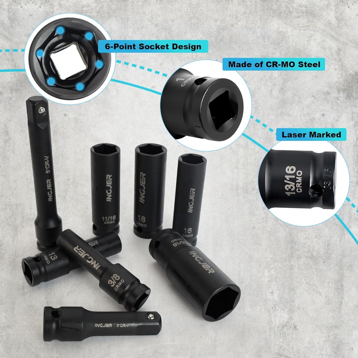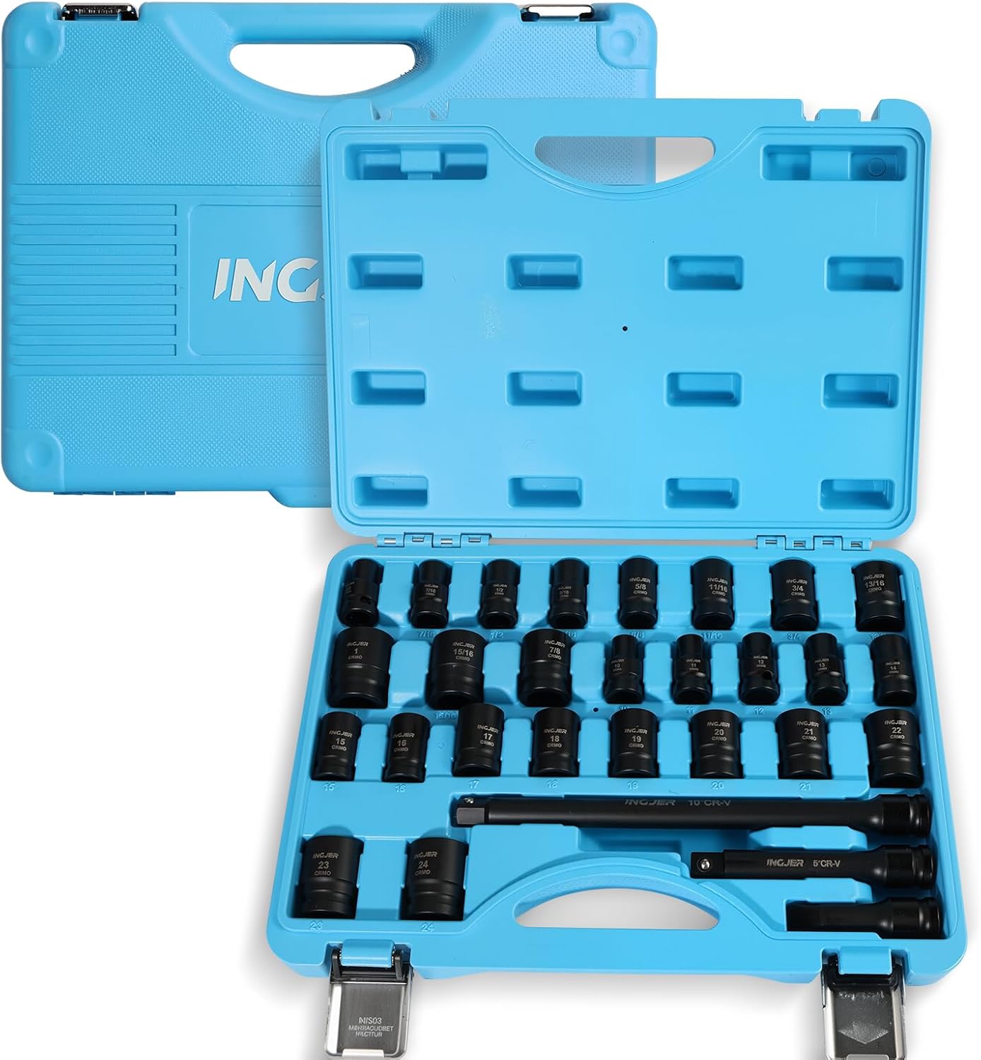 | Included Components | 3", 5" and 10" deep drive extension barsJoint, Socket SAE Sizes: 3/8, 7/16, 1/2, 9/16, 5/8, 11/16, 3/4, 13/16, 7/8, 15/16, 1inch Socket Metric Sizes: 10, 11, 12, 13, 14, 15, 16, 17, 18, 19, 20, 21, 22, 23, 24mm |