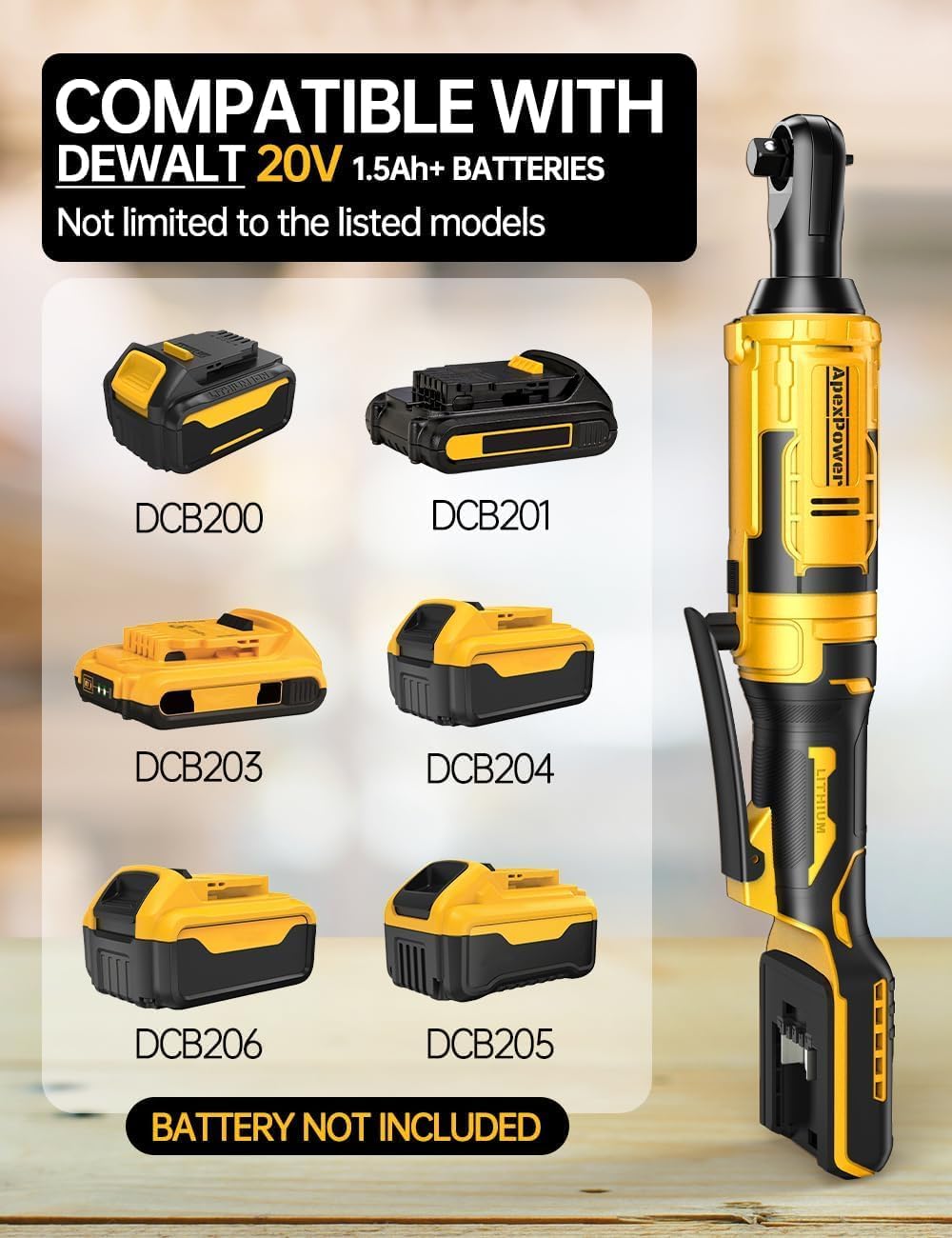 | Included Components | 1 x 1/2-Inch to 3/8-lnch Adapter, 1 x 3-Inch Extended Socket, 1 x ApexPower 1/2 Inch cordless ratchet wrench, 1 x Carrying Bag, 7 x Ratchet Sockets |