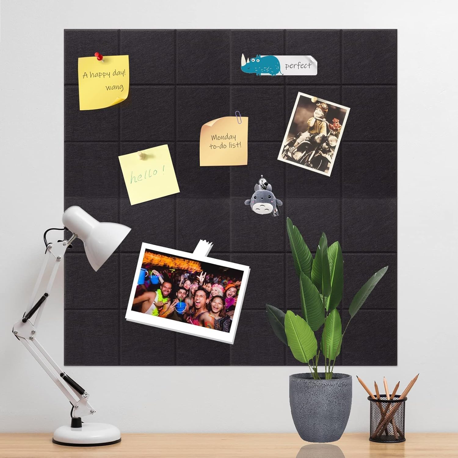 12 Pcs Large 11.8" x 11.8" Felt Bulletin Board for Wall Square Felt Board Tiles with 60 Push Pins Self Adhesive Cork Board Tiles Tack Board for Office Kitchen Classroom Photos Notes Memo DIY (Black)
