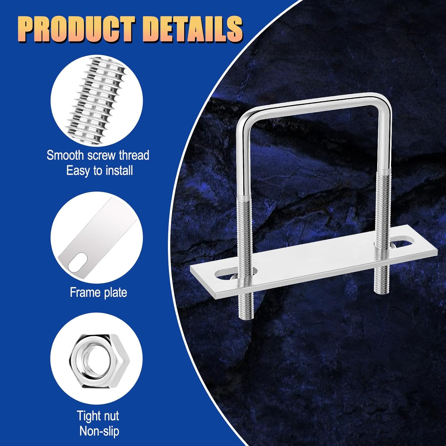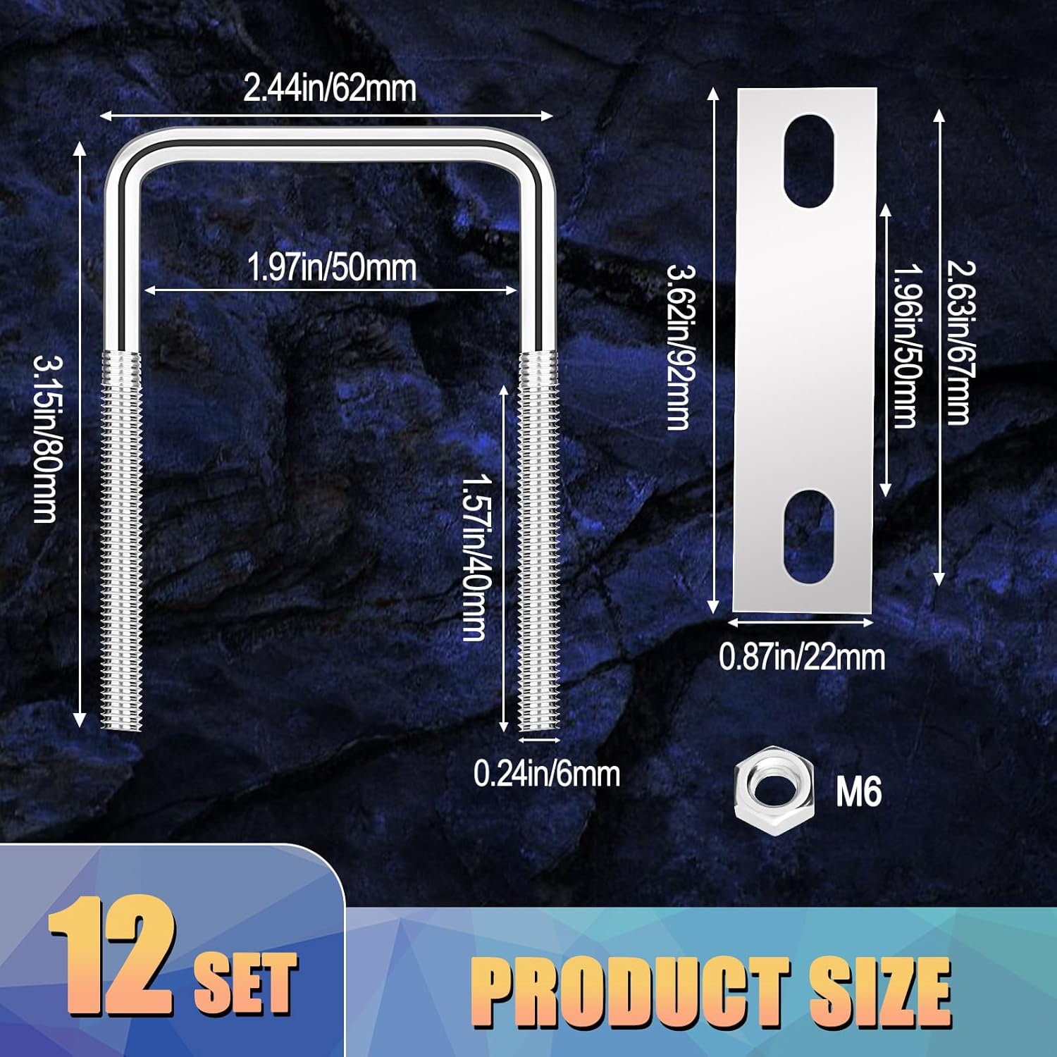 12 Pcs Square U Bolts 2 Inch Wide,1/4"x 2"x 3.15" U Bolt Clamp in Zinc with Nuts and Frame Plates with Strict Quality Standards Specifications: Material:Carbon Steel Shape :SquareSize:1/4" x 2" x 3.15" Features: Why Choose Our Square U Bolt ?The quantity that meets your needs:The zinc-coated square U-bolt set includes 12 U-bolts, 24 nuts, and 12 frame plates, providing ample quantity for your needs and replacements. All accessories are crafted from galvanized steel Wide range of applications:U-bolts are used to secure or attach locking components to rectangular wooden and metal objects. Widely applicable across industries such as industrial, manufacturing, maintenance, automotive, and apparel production, U-bolts are the ideal choice for fastening pipes, wood, trailers, and more.❀High-quality materials:The square U-bolts are made of galvanized carbon steel, ensuring durability and reliability with excellent rust and corrosion resistance. Each U bolt is capable of bearing weight, and these galvanized square U-bolts prevent rust, corrosion, acid erosion, and wear, performing well even in rainy and humid environments.Reliable service:As we are so strict with our Square U Bolt quality, we have confidence. So we would refund 2 times price if you receive defective product What's in the package:12 * U-bolts, 14* nuts,and 12* frame plates