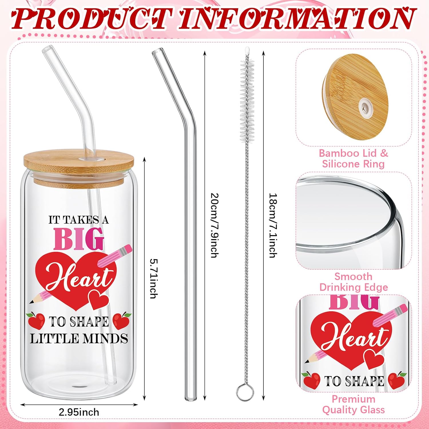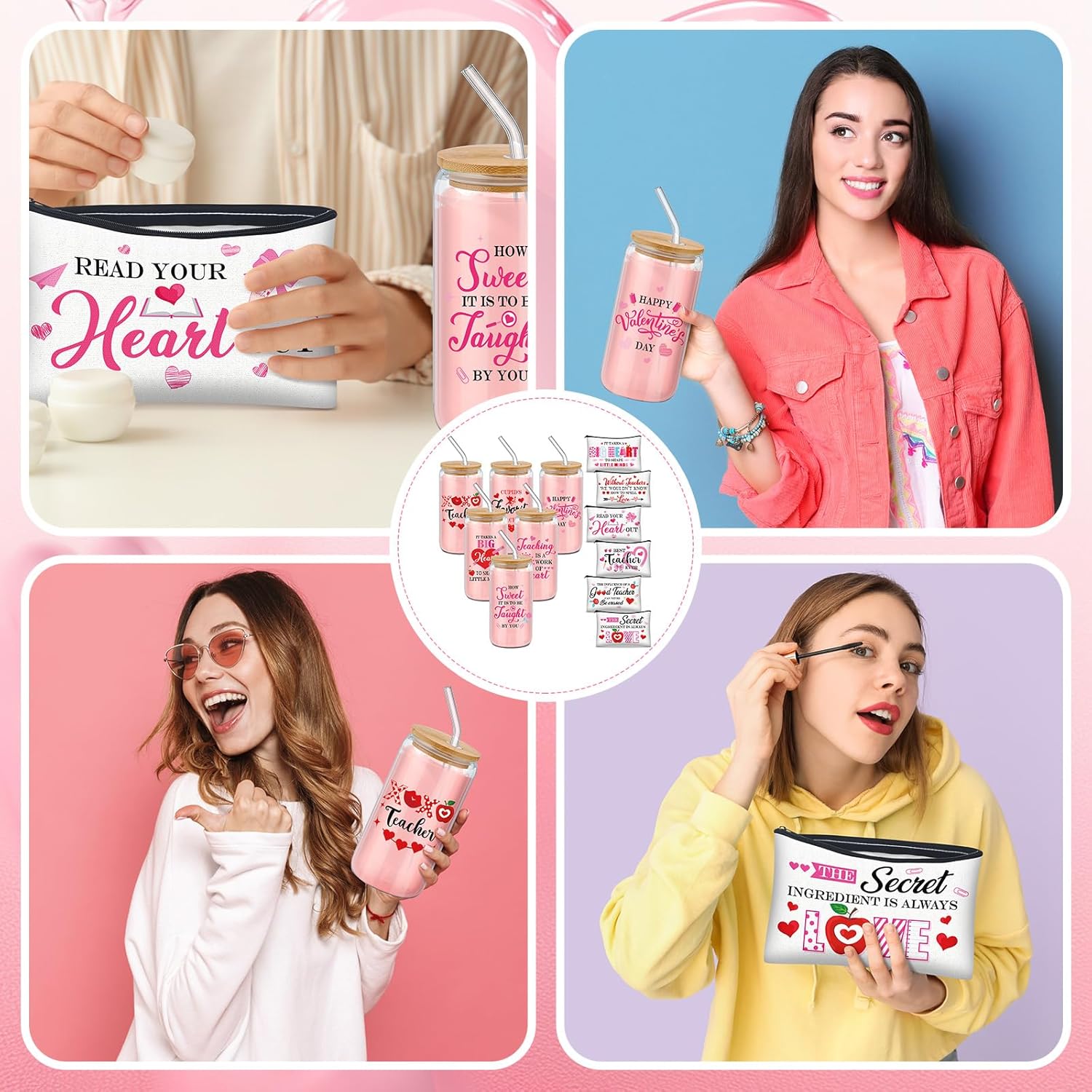 Features: Celebrate Valentine's Day with these appreciation gifts for teachers that speak the language of love. The valentines heart shaped design adds a touch of romance, making the teacher coffee cups and cosmetic bags for Valentine's Day. Each piece strikes a balance between cute and functional With colors primarily in pink and white, accented by touches of black and red, these valentine teacher appreciation gifts cater to diverse tastes and styles. This vibrant yet elegant color scheme fits any setting Specifications: Material: Cup: glass Cosmetic bag: canvas Color: mainly pink and white Size: Cup: 16 oz, approximately 7.5 cm/2.95 inches in diameter, 14.5 cm/5.71 inches in height Cosmetic bag: approx. 9.06 x 5.91 inches Package includes: 6 x Cosmetic bags 6 x Cups 6 x Straws 6 x Brushes Notes: Manual measurement, please allow slight errors on size. The color may exist a slight difference due to different screen displays