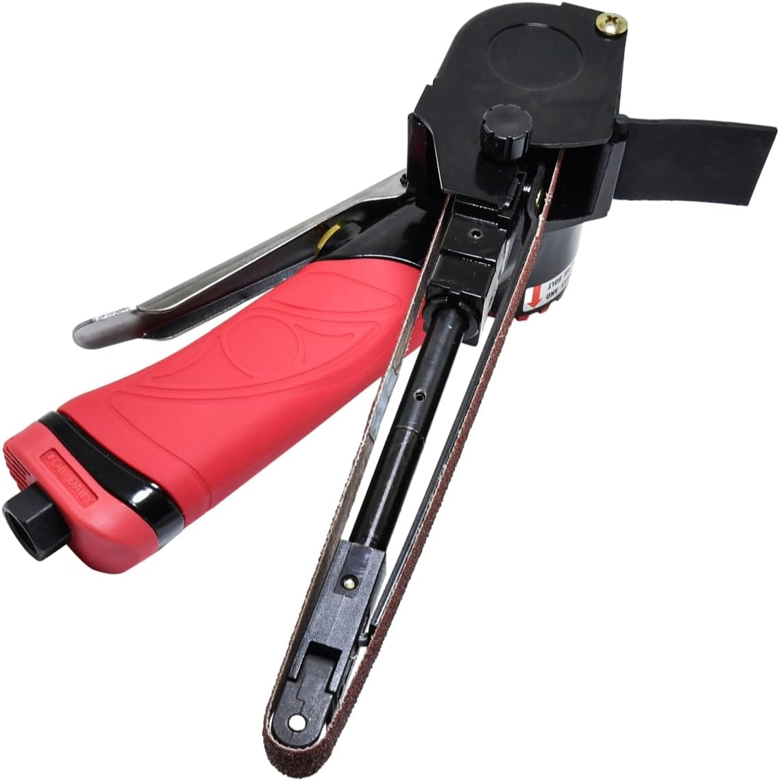 Air Belt Sander 1/2 inch x 18 inch; 20,000RPM is a compact pneumatic belt sander for fast and smooth surface work. It removes weld marks, rust and rough edges on metal, aluminum, wood, plastic, glass and stone.With a slim 1/2 inch × 18 inch, (12.7 × 450 mm) belt and high speed, it is ideal for finishing, trimming and polishing in workshops and DIY projects. This air belt sander is light, easy to hold and simple to control.It reaches tight corners, curves and narrow gaps that big sanders cannot reach.Use it in auto body shops, metal factories, furniture production and for home repair.Just change to a different sanding belt grit to match each job and material. Key Features Fast and smooth finish – 20,000 RPM speed removes weld marks, rust and burrs quickly for a clean surface.Works on many materials – metal, aluminum, wood, plastic, glass and stone, by changing sanding belts.Slim belt for tight spaces – 1/2 inch; narrow belt reaches corners, edges, curves and small gaps easily.Perfect before painting – gives a flat, smooth surface before coating, painting or final assembly.Lightweight and low vibration – about 0.9 kg, easy to control and more comfortable for long use. Specifications Type: Air Belt Sander (Pneumatic Belt Sander)Belt Size: 12.7 mm × 450 mm (1/2 inch × 18 inch;)Free Speed: 20,000 RPMNet Weight: 0.9 kgAir Consumption: 0.64 m³/minAir Inlet: 1/4 inch; (standard air hose connector size)Hose Size (I.D.): 6.5 mm (inside diameter of air hose)Working Air Pressure: 90 psi (6.3 kg/cm²)Vibration: 4.0 m/s² Applications Weld finishing: remove weld beads and smooth welded joints on steel, stainless and aluminum parts.Metal part finishing: clean edges, deburr holes and finish metal carts, frames and brackets.Cabinet and furniture work: smooth steel cabinets, metal furniture and decorative hardware.Surface prep before coating: prepare metal and wood surfaces before painting, powder coating or plating.Plastic and glass finishing: trim plastic parts and lightly finish glass edges with suitable belts.Stone and decorative wood: touch up stone pieces and decorative wood items where detail is needed.Auto, ship and aircraft repair: clean and smooth small areas on body panels and structures. Feature High-speed belt drive: the 20,000 RPM air motor gives strong power, so you remove material fast and save working time.Multi-material ability: with different grits of sanding belt, you can grind, sand or polish metal, wood, plastic, glass and stone with one tool.Narrow arm design: the slim sanding arm and 1/2 inch; belt let you work in tight corners, inside frames and along narrow edges.Adjustable sanding angle: the arm angle can be changed so you can match different work positions and surfaces.Lightweight body: about 0.9 kg reduces hand and wrist fatigue during long jobs in the shop.Industrial air motor: stable power for light and medium duty continuous use in professional workshops.Easy belt change: quick belt change design helps you switch grits in seconds and keep working efficiently. Whether you work in an auto shop, metal workshop, furniture factory or at home, this air belt sander 1/2 inch x 18 inch; 20,000RPM is a powerful and easy tool to get a clean, professional surface finish.