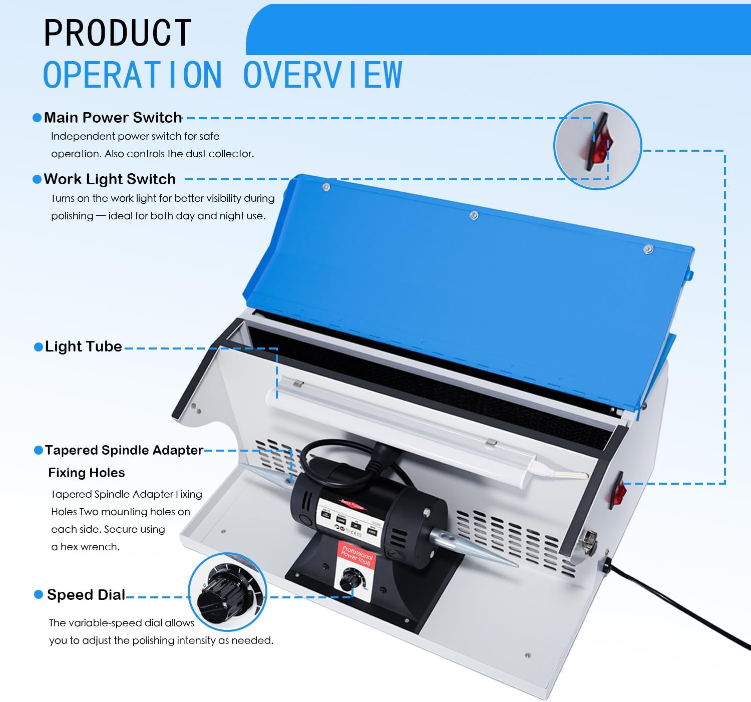 Professional Jewelry & Rock Polishing Machine for Precision Work Experience powerful polishing performance with this upgraded jewelry polishing machine, designed for both professionals and hobbyists. Equipped with a high-efficiency 800W or 1200W motor, it delivers steady torque for jewelry, gemstones, metals, and small workshop projects. Complete Accessory Kit Included This polishing machine comes fully equipped with everything you need to start right away: 1 grinding wheel, 2 fiber wheels, white & yellow buffing wheels, safety glasses, carbon brushes, hex wrench, connecting rod, pressure plates, wrench, mini dustpan, green & white polish compounds, brush, and screwdriver — everything you need to start polishing immediately. Why Choose This Jewelry Polisher Powerful 800W / 1200W motor for high efficiency Variable speed up to 10,000 RPM (with or without digital display) Dual exhaust and dust collector for a cleaner workspace LED light & eye shield for safe operation Compact, stable, and ready to use out of the box For Professionals & DIY Enthusiasts Whether you’re polishing fine jewelry, shaping gemstones, or restoring metal parts, this bench buffer polisher offers precision, performance, and safety—all in one powerful unit.