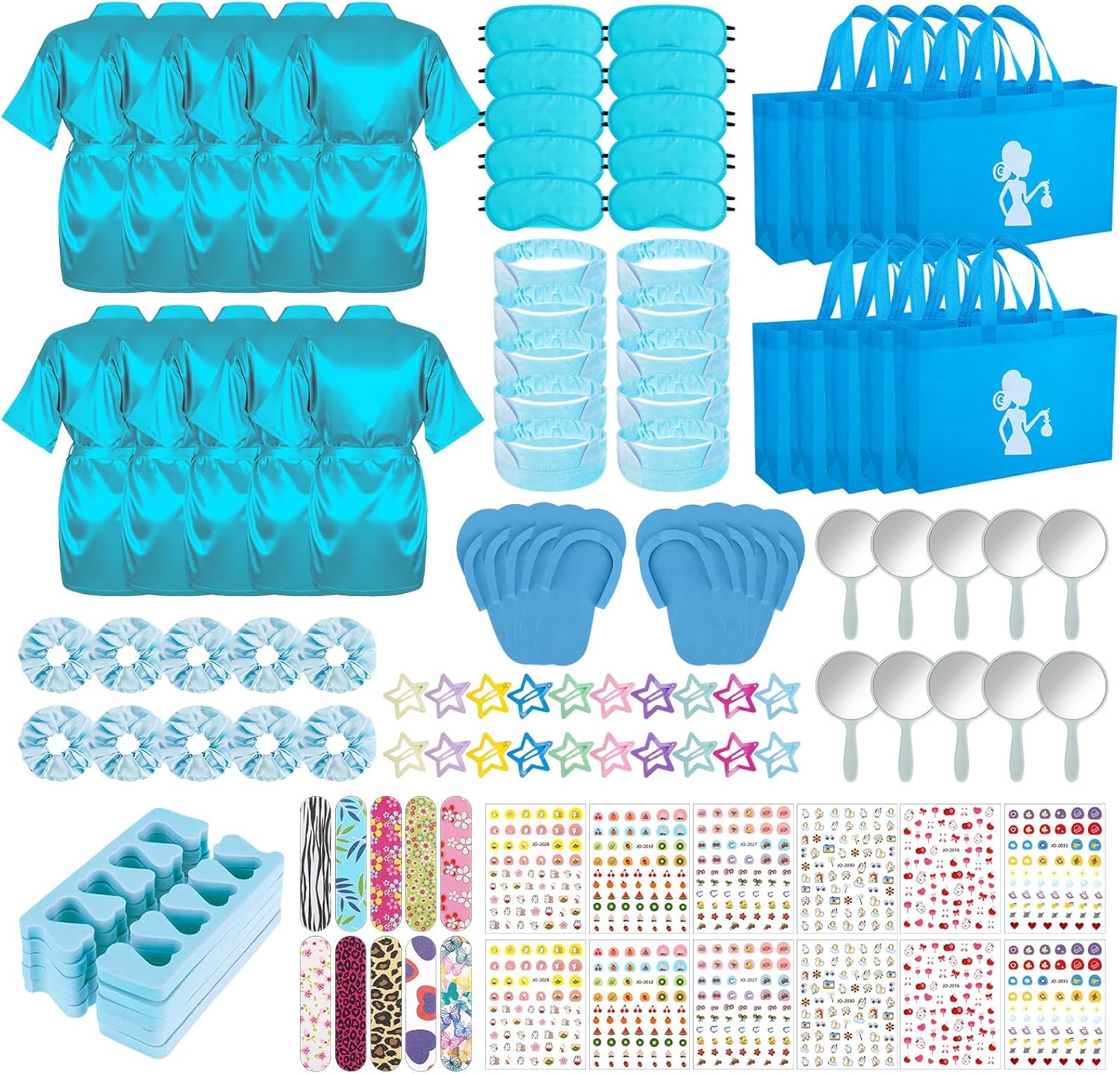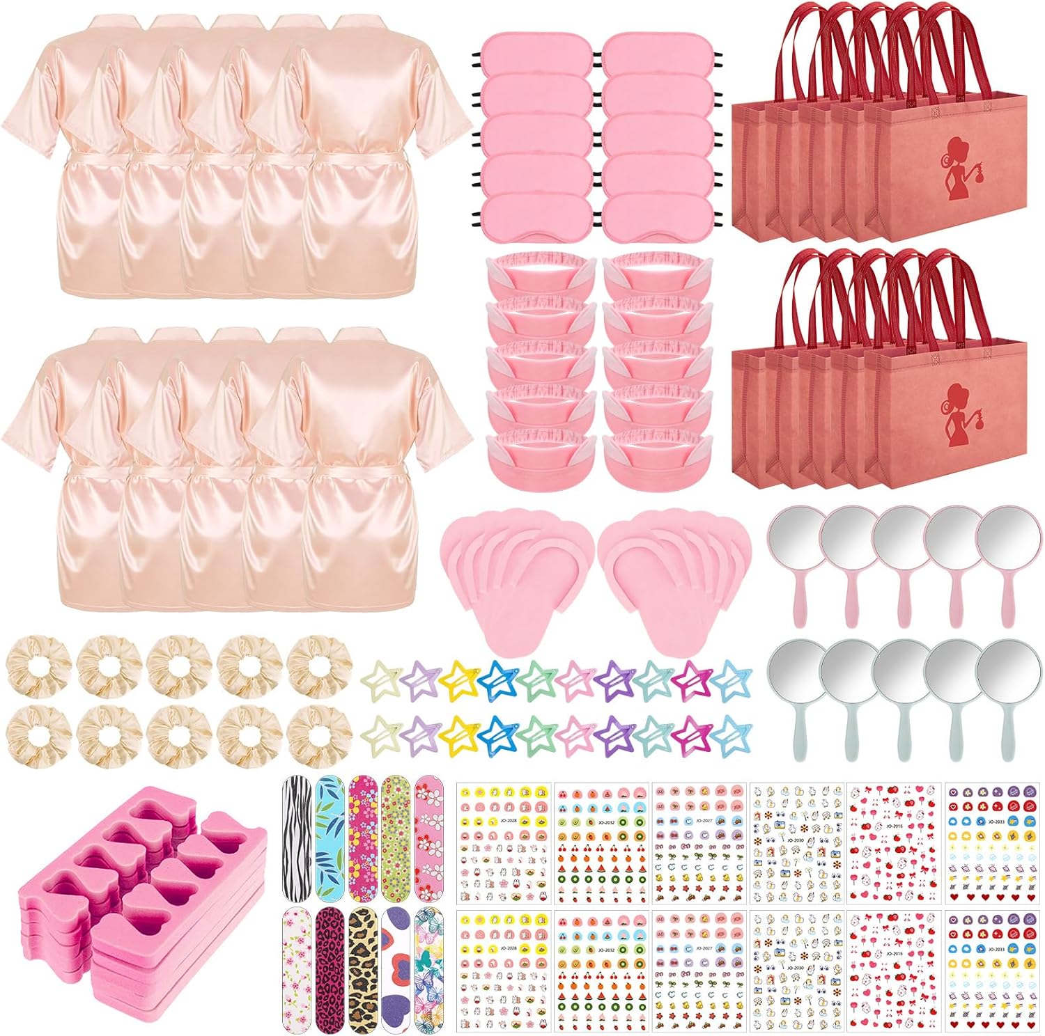 | Included Components | 10 kids satin robes, 10 eye masks, 10 pairs of foam slippers, 10 hair scrunchies, 20 star clips, 10 10 spa headbands, 10 toe separators, 12 manicure stickers, 10 tote bags, 10 rubbing strips , 10 hand mirrors |