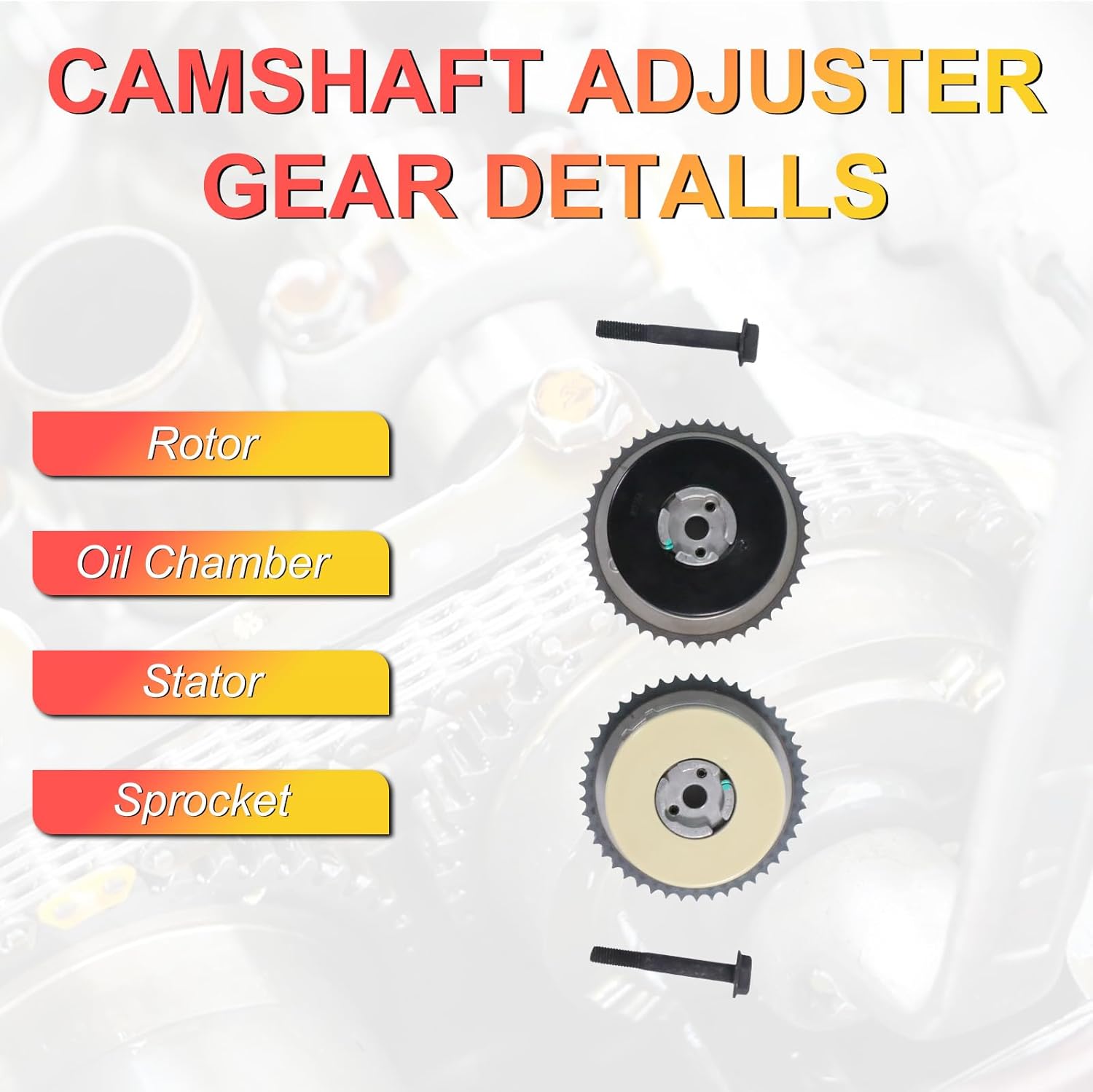 The Engine Timing Sprocket Gear Part Number:12578515 12578516 12621505 917-270 917-254 917270 917254 TL29756Q This Camshaft Phaser Adjuster Replacement With: For Buick: Fits for 2011 LaCrosse 2.4L Fits for 2011-2013 Regal 2.0/2.4L For Chevy: Fits for 2006-2010 Cobalt 2.0/2.4L Fits for 2010-2011 Equinox 2.4L Fits for 2006-2011 HHR 2.0/2.4L Fits for 2008-2012 Malibu 2.4L For GMC: Fits for 2010-2011 Terrain 2.4L For Pontiac: Fits for 2007-2008 G5 2.4L Fits for 2006-2010 G6 2.4L Fits for 2006 Pursuit 2.4L Fits for 2006-2009 Solstice 2.0/2.4L For Saturn: Fits for 2007-2009 Aura 2.4L Fits for 2006-2007 Ion 2.4L Fits for 2007-2010 Sky 2.0/2.4L Fits for 2007-2010 Vue 2.4L Package includes: Intake Exhaust Camshaft Phaser Gear*2 Our Camshaft Adjuster Gear Product Features: (1)Stable performance, high reliability. (2)High-temperature resistant, long service life. (3)Easy to install, fast response. (4)Made of high-quality metal materials, safe and reliable. (5)Complete accessories, strong performance.