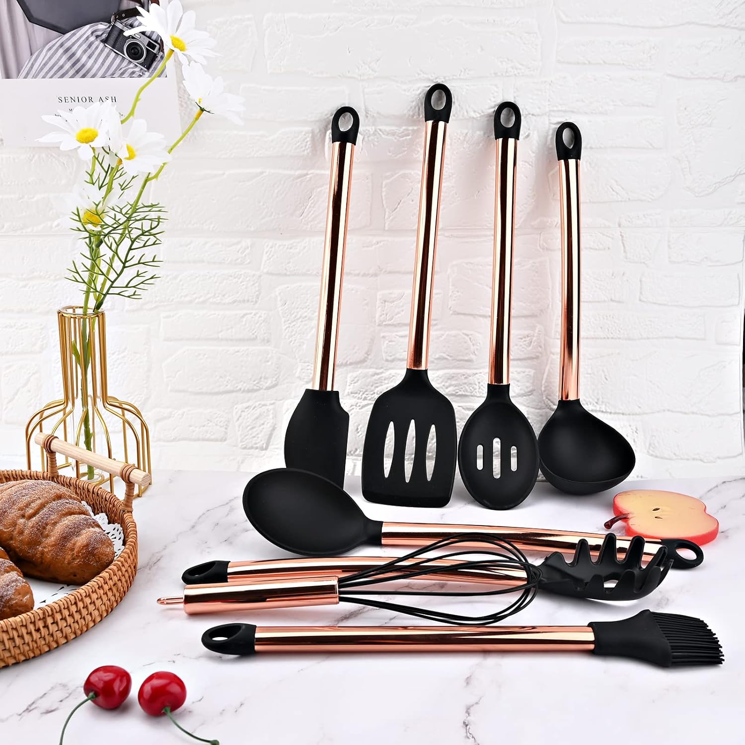 BRIIEC Copper and Black Silicone Cooking Utensil Set Silicone Kitchen Utensils are very popular in the market - The heads and longer handles can better control and ease of serving. These heat resistant silicone utensils can bring most of fun in your kitchen life. Each piece in this set is very nice designed to work perfectly and last for many years. Food grade silicone material High-quality black silicone materials with copper stainless steel handle, without harmful substance release into food, healthy and safe for your daily cooking. Because of the non-stick surface, they are quite easy to clean by hand and dishwasher safe. The copper and black utensils with holder brighten your kitchen and won’t mess up. All the different options you will have with this set. Anti-scratch Soft silicone won’t scratch cookware or your expensive pans. High-quality food-grade silicone fully covers the high-strength inner core, Which is tough, Durable, And not easy to deform.Smooth silicone edges can protect the pot, perfect for everyday cooking, baking, frying, mixing and stirring. Gifts This nonstick utensils cooking set with exquisite package box would also make an exceptional and thoughtful Thanksgiving, Christmas, Mother’s Day, wedding, or housewarming gift for the chef in your life. "