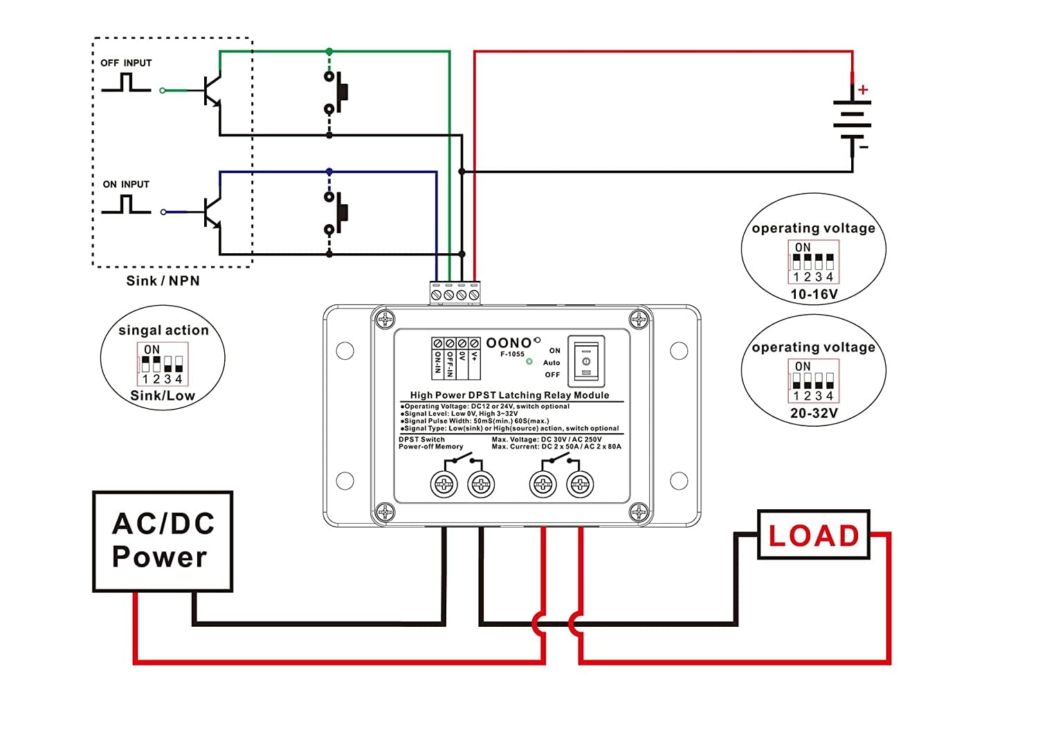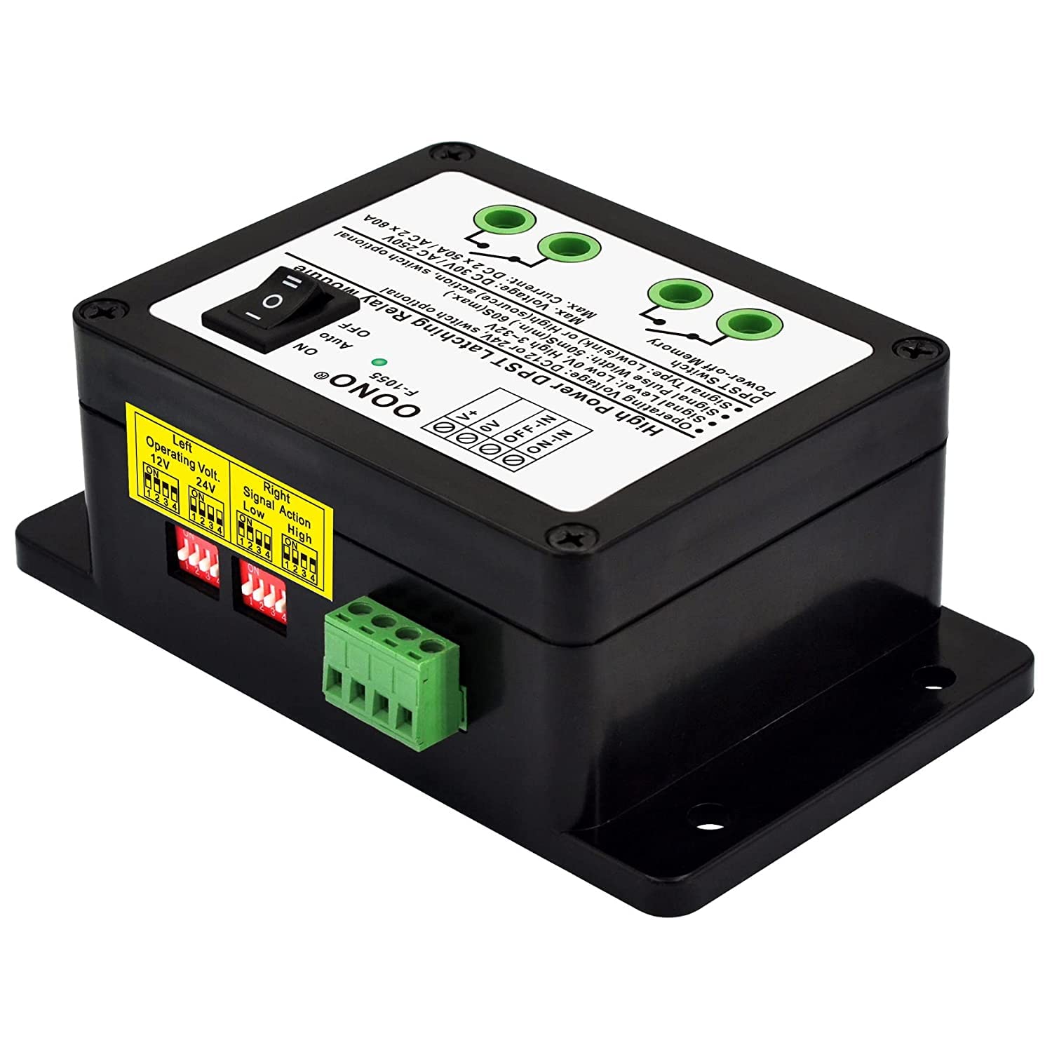 Features: 1, If you are looking for a latching relay with power-off memory, then this module will be very suitable for you. Even if the operating power is turned off, the status of the output switch will not be affected in any way, it will remain in the state before the power was turned off. 2, Output switch DPST (Double Pole Single Throw). Rated current/voltage AC 80A/250V or DC 50A/30V (each switch channel). 3, Operating voltage support DC 12V / 24V, the red DIP switch on the side can be set. 4, Support signal High or Low action, the red DIP switch on the side can be set. Can support multiple types of controllers, Raspberry Pi / Arduino / ESP32 / BeagleBone / PLC / MCU / DSP etc, of course you can also directly connect two momentary switches. With override switch function, override switch setting to ON or OFF, external control signals will be invalid. 5, Screw-type terminal blocks facilitate the connection of cables. The ABS plastic shell ensures better electrical insulation. Specifications: Operating Voltage: DC 10 - 16V(at 12V mode), DC 20 - 32V(at 24V mode), switch optional. Operating Current: 0.3mA Quiescent, override switch set to AUTO. 0.6mA Quiescent, override switch set to ON or OFF. 350mA, when the control signal pulse action. duration is the same as the control pulse signal width time. Control Signal Voltage: Low level 0 ~ 0.5V, High level 3 ~ 32V Control Signal Current (Low action mode): 0.5mA Control Signal Current (High action mode): 0.25mA/3.3V, 0.43mA/5V, 1.2mA/12V, 2.3mA/24V Control Signal Type: High or Low action, switch optional. Control Signal Pulse Width: 50mS / min, 60S / max. Switch Rated Voltage: AC 250V, DC 30V Switch Rated Current: AC 80A, DC 50A (each switch)
