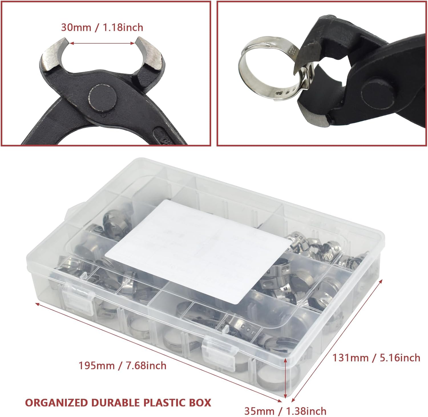 130pcs Heavy Duty PEX clamp Assortment Kit with Pliers, Stainless Steel Clamps 1/4"- 0.92"(6-23.5mm), PEX Cinch Crimp Rings Pinch Clamps for Water Pipe, Plumbing and Pipe Fitting Connections Product information: Material:304 stainless steel Color:sliver Feature: The edge of all clamps are polished smooth, special treatment with edging technology to avoid damage to the pipe and ensure safety Light weight, less interference. Interlocking ring. 360 ° seal protection. Universal for all PEX pipe fitting. Package include: 1 Clamp Cinch Crimp Tool 15pcs 6-7mm 1/4” - 9/32” 15pcs 7-8.7mm 9/32” - 11/32” 20pcs 8.8-10.5mm 11/32” - 27/64” 20pcs 10.3-12.8mm 13/32” - 1/2” 20pcs 12.8-15.3mm 33/64” - 39/64” 20pcs 15.3-18.5mm 39/64” - 47/64” 10pcs 17.8-21.0mm 45/64” - 53/64” 10pcs 20.3-23.5mm 51/64” - 59/64”