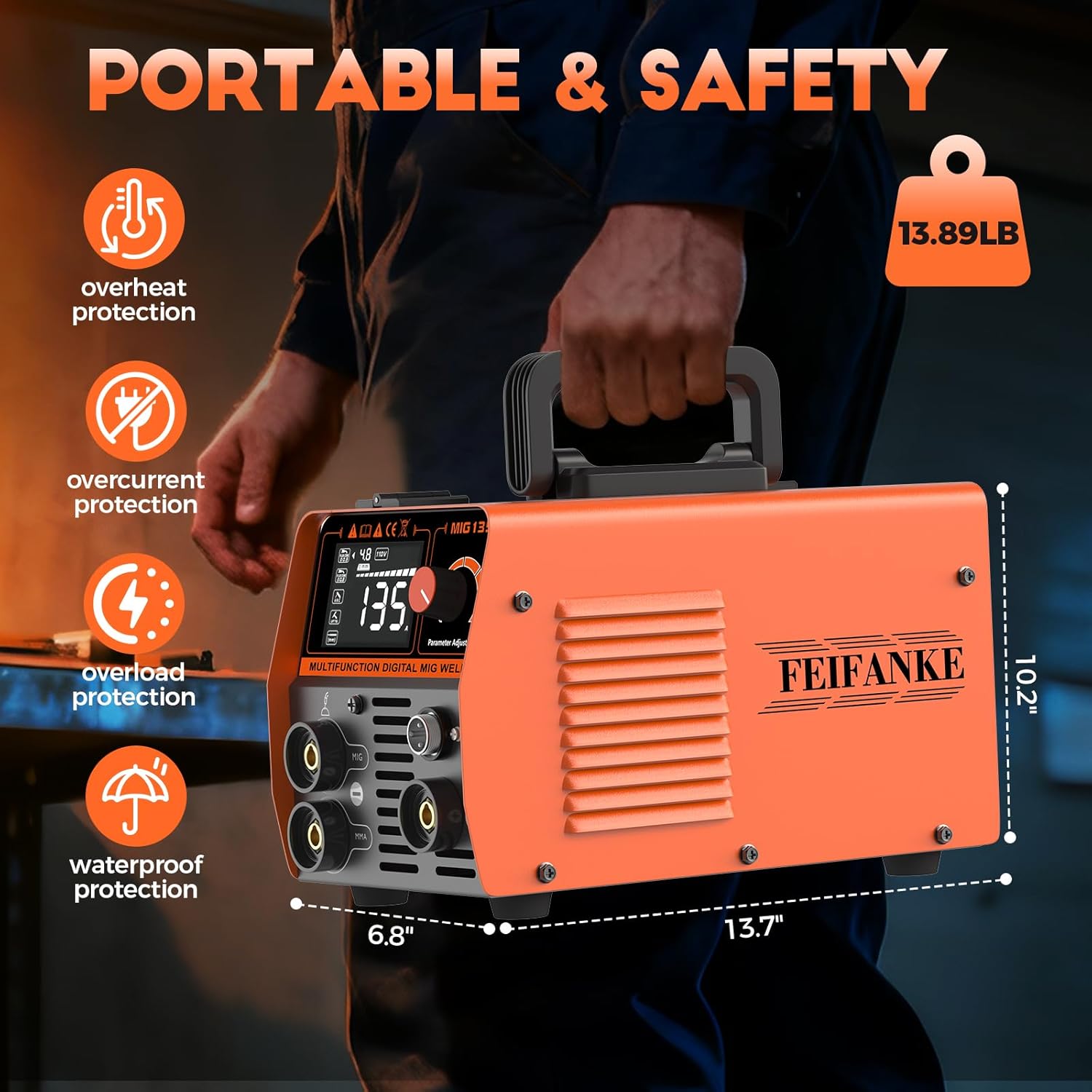 | Included Components | 1 x 1.8m/5.9ft Electrode Holder & 1 x 1.2m/3.94ft Ground Clamp, 1 x 135A 110V MIG Welder, 1 x 2m/6.6ft MIG Torch & 1 x 0.8mm 0.5KG Flux Core Wire, 3 x 0.8mm Conductive Nozzles & 3 x 1.0mm Conductive Nozzles |