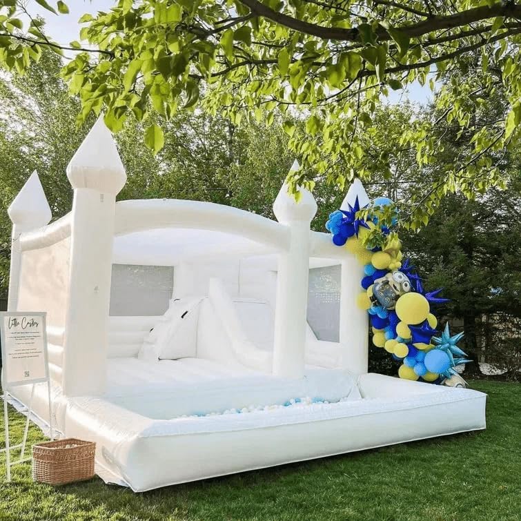 White Bouncy House with Unique Castle Design - Safe, Portable, and Fun! This high-strength bouncy house has been rigorously tested and certified to ensure safety and durability, and its internal design and structure make it more stable and secure during use. With a product size of 15ft x 13ft x 11ft, this bouncy house can accommodate up to 5-6 small children with a maximum weight of 200 pounds. Plus, it’s easy-to-carry design makes it perfect for use at home, Apply to all parties, birthdays, couple parties, weddings, baptism, and anniversary. Great Fun for Kids 1. Easy to set up in less than five minutes 2.Slide & Ball Pit Design bring more fun for kids. 3.Net Wall Design can protect children when jumping. How to set up 1、Open the storage bag and remove all accessories. 2、Spread the bounce house flat, preferably with the included cushion to keep the bounce house clean. 3、Tie the inflation tube to the air outlet of the blower. 4、Turn on the power supply of the blower, and the blower must be on all the time when the product is in use. 5、Secure the trampoline by passing the ground nails through the endless belt of the trampoline to avoid shifting during play.