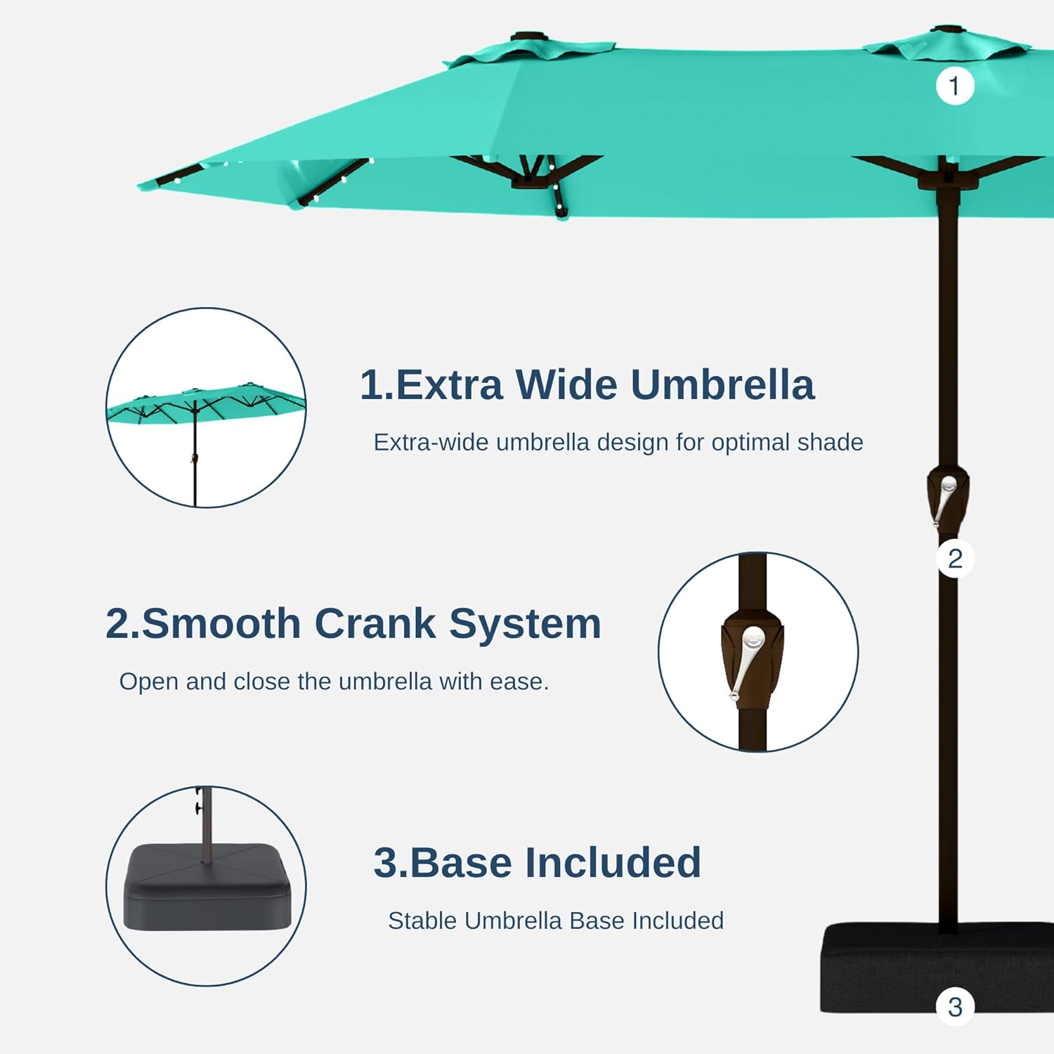 Transform your backyard into a relaxing oasis with this 13FT Double-Sided Patio Umbrella with Solar Lights, a stylish and functional addition designed for year-round comfort. Featuring 48 built-in solar-powered LED lights, this outdoor umbrella creates a warm, inviting glow for evening dinners, poolside relaxation, or late-night conversations. Powered entirely by sunlight, it requires no electricity or cables, giving you bright, energy-efficient illumination every night. The extra-large 13.1 ft x 7.2 ft canopy provides generous shade coverage for outdoor dining tables and seating areas, making it perfect for family gatherings, BBQs, or café-style patios. Constructed from fade-resistant 180 GSM polyester with UPF 30+ protection, it blocks harmful UV rays and maintains its rich color even under prolonged sunlight. A powder-coated steel pole and 12 reinforced ribs ensure long-lasting durability, while the vented top design enhances airflow, keeping your space cool and stable in breezy conditions. The crank lift mechanism allows effortless setup and takedown, and the tie strap helps secure the canopy neatly when not in use. Whether you’re relaxing in the garden, hosting outdoor brunches, or unwinding by the pool, this solar LED double-sided umbrella offers both elegance and performance — day and night.