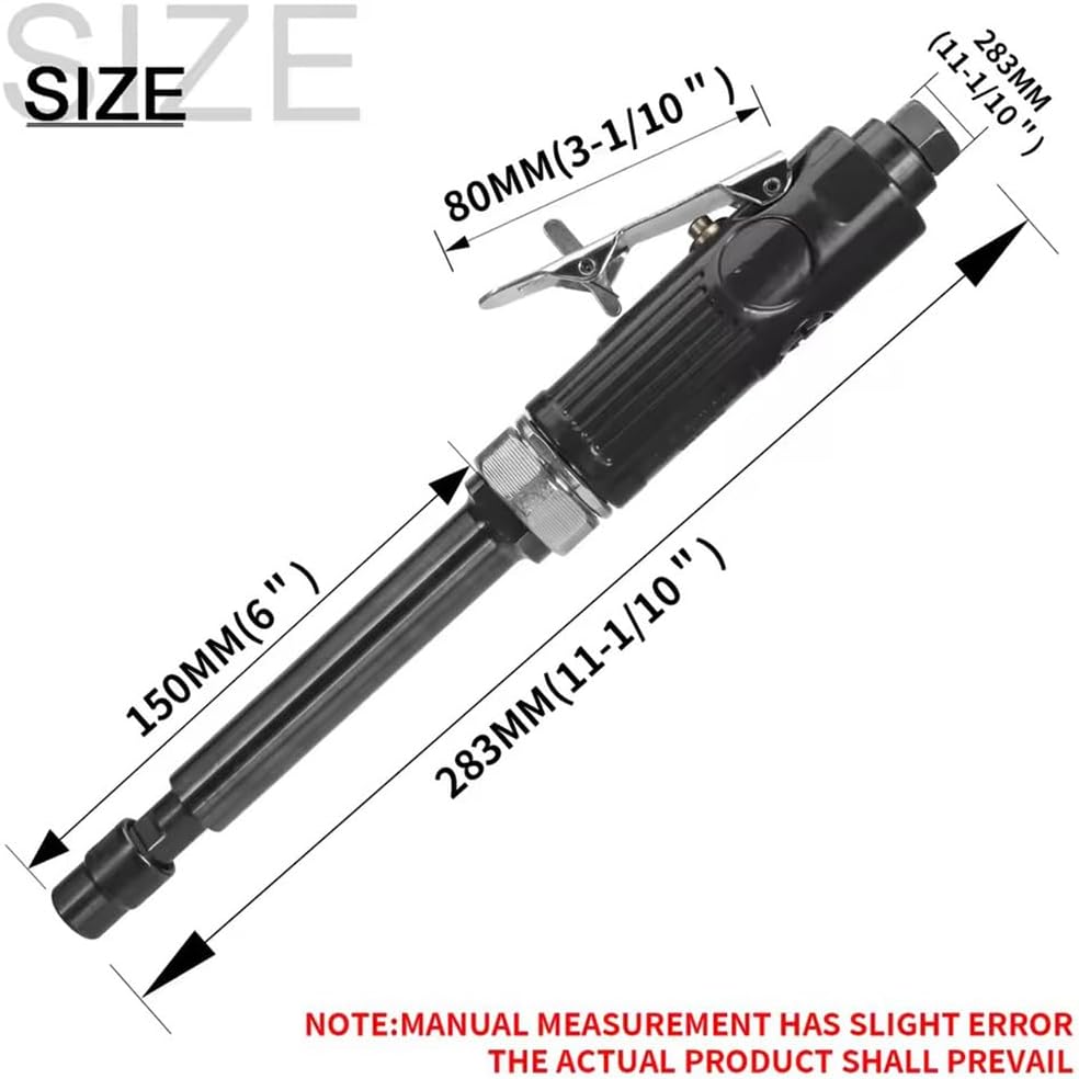 Introducing the Extended Shaft Air Die Grinder, your go-to tool for precision grinding and effortless access to challenging spaces. Engineered for efficiency, this air die grinder features an extended shaft that allows you to reach tight spots with ease, enhancing your workflow for various applications. Powered by a robust motor, this grinder delivers high-speed performance, making it perfect for tasks such as mold making, hardware finishing, glass engraving, stone shaping, and circuit board manufacturing. The ergonomic handle is thoughtfully designed to provide comfort, helping to reduce hand fatigue during extended use, so you can work longer without discomfort. Key Features: - Extended shaft design for enhanced accessibility to hard-to-reach areas, simplifying your projects. - High-speed operation with a powerful motor ensures effective grinding and cutting performance. - Ergonomic handle minimizes hand strain, allowing for comfortable and prolonged use. - Quiet operation with low air consumption, promoting a more pleasant work environment. - Versatile enough for a range of applications, from intricate crafting to industrial tasks. Specifications: - Name: Extended Shaft Air Die Grinder - Color: Black - Collet Size: 1/4" / 6mm - Average Air Consumption: 3.5 CFM - No-Load Speed: 22,000 RPM - Working Pressure: 90 PSI - Hose Size: 3/8" - Overall Length: 281mm / 11" - Air Inlet: 1/4" Package Includes: - 1 Extended Shaft Air Die Grinder - 2 Wrenches - 1 Joint - 1 Chuck Elevate your craftsmanship with the Extended Shaft Air Die Grinder, designed to deliver the performance and comfort you need for any project. Experience the difference today!