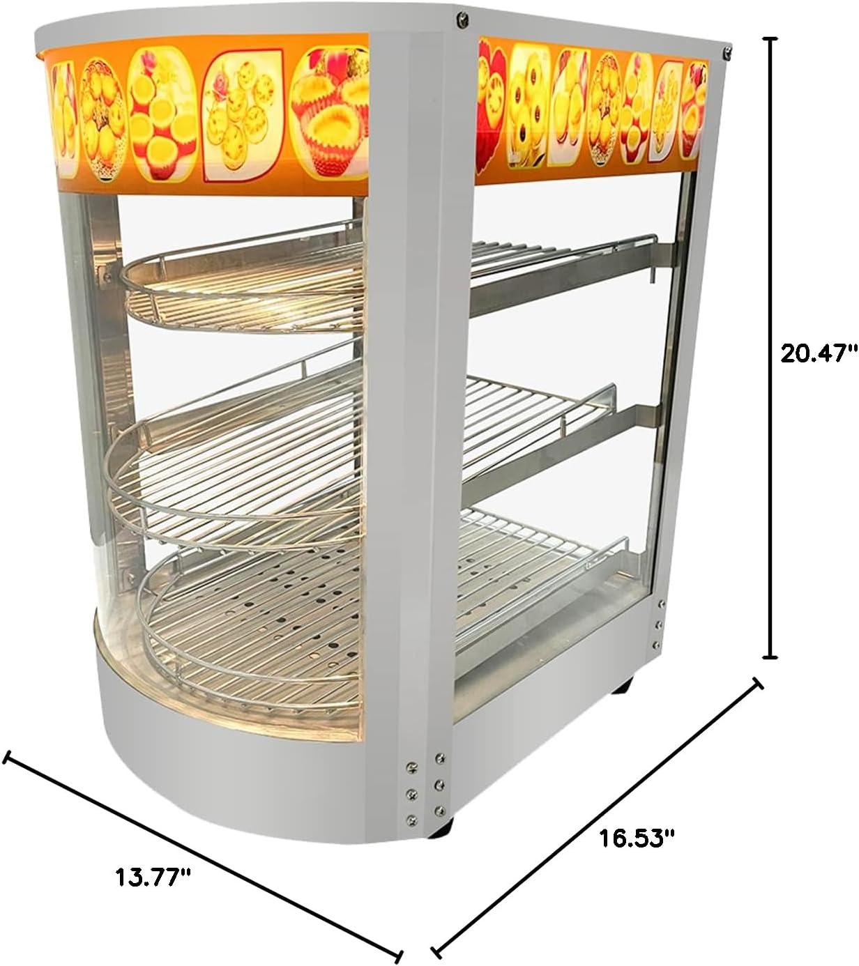 commercial countertop food warmer displayThis countertop display warmer is specially designed for displaying food at holding temperature and are widely used in the food service industry. It is also equipped with a temperature control.It opens from the back,and it comes with 3 tiers steel shelves.Product SpecificationPower:800WDimension:13.77x16.53x20.47"Voltage:110V/60HzPackage Include1xhot food display case