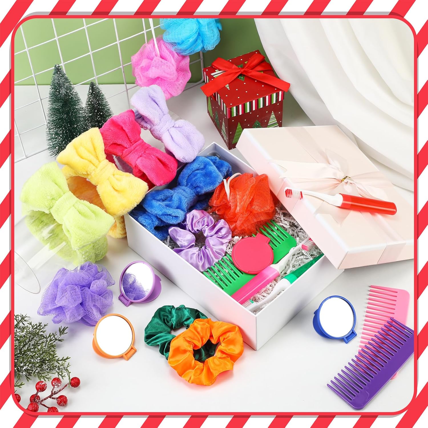 Features: Fun and Functional: The gift-box bulk items adds color and joy to grooming routine. Items like bath flowers and wide-tooth combs can spark imaginations when role-play or engage in self-care, adding fun to everyday chores Ideal Gifts: Combining practicality with beauty, this mini toiletry set transforms any Christmas gift-box into a treasure trove of surprises, can experience the excitement and joy of the festive season. Specifications: Material: coral fleece, plastic Color: multicolor Package includes: 24 x Folding toothbrushes, 24 x Wide-tooth combs 24 x Headbands, 24 x Bath loofah shower 24 x Hair Rings, 24 x Mirrors Notes: Manual measurement, please allow slight errors on size. The color may exist a slight difference due to different screen displays