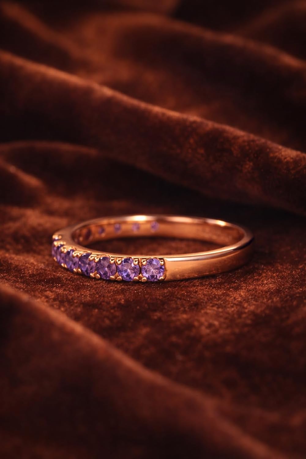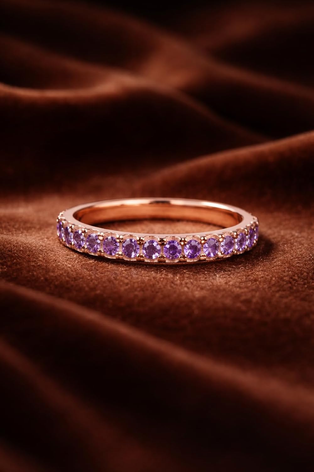 This elegant amethyst half eternity ring is designed for women who love minimal yet meaningful jewelry. Sparkling round cut purple amethyst gemstones decorate the top of the band, creating a soft romantic shimmer while keeping the underside smooth for comfort. The delicate rose gold band gives a warm feminine tone and pairs perfectly with engagement rings as a wedding band or enhancer. It can also be worn alone as a stacking ring for a trendy everyday style. Amethyst, the February birthstone, symbolizes peace, love, and emotional balance, making this ring a thoughtful gift filled with sentiment. Whether celebrating an anniversary, promise, or special occasion, this ring is a timeless keepsake she will cherish for years.