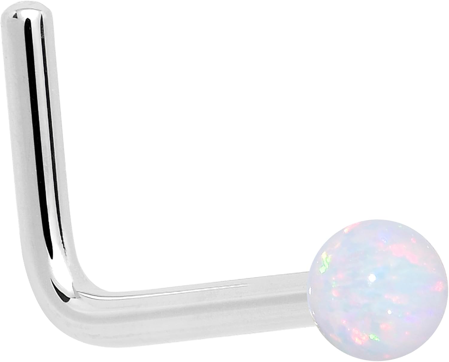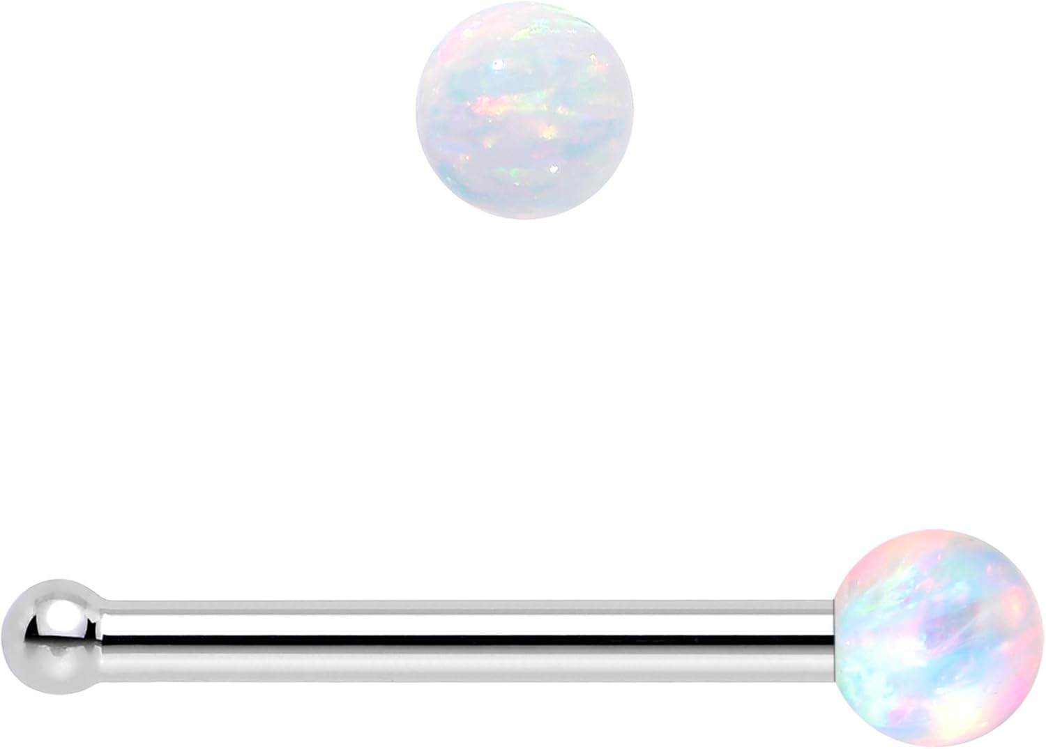 Radiant Luxury in Every Detail. Capture attention with a nose ring that redefines delicate elegance. Handcrafted by our master jewelers, this 14k gold beauty features a stunning synthetic opal that shimmers with enchanting, iridescent color. Handmade nose ring piercing jewelry Made in the USA. The warm luster of real 14k gold paired with a luminous synthetic opal creates a flawless balance of classic and contemporary. Hypoallergenic and lightweight, this handcrafted piece ensures comfort and confidence all day long. 18G nose ring made from real solid gold. Specifications: 18 Gauge (1mm), 1/4" (6mm) Length, Solid 14k Gold, 2.5mm Synthetic Opal Ball, Handmade in USA, Hand polished