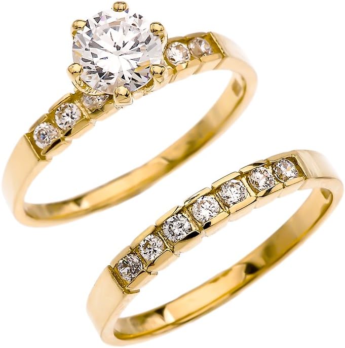 Propose with a ring that will shine as radiantly as you do when you're with your better half. Made from the finest gold quality, this handcrafted gold engagement ring is polished to perfection by our best jewelry makers and handset with 6.5 mm White Topaz centerstone, with 21 diamonds collectively on the engagement ring and wedding band.