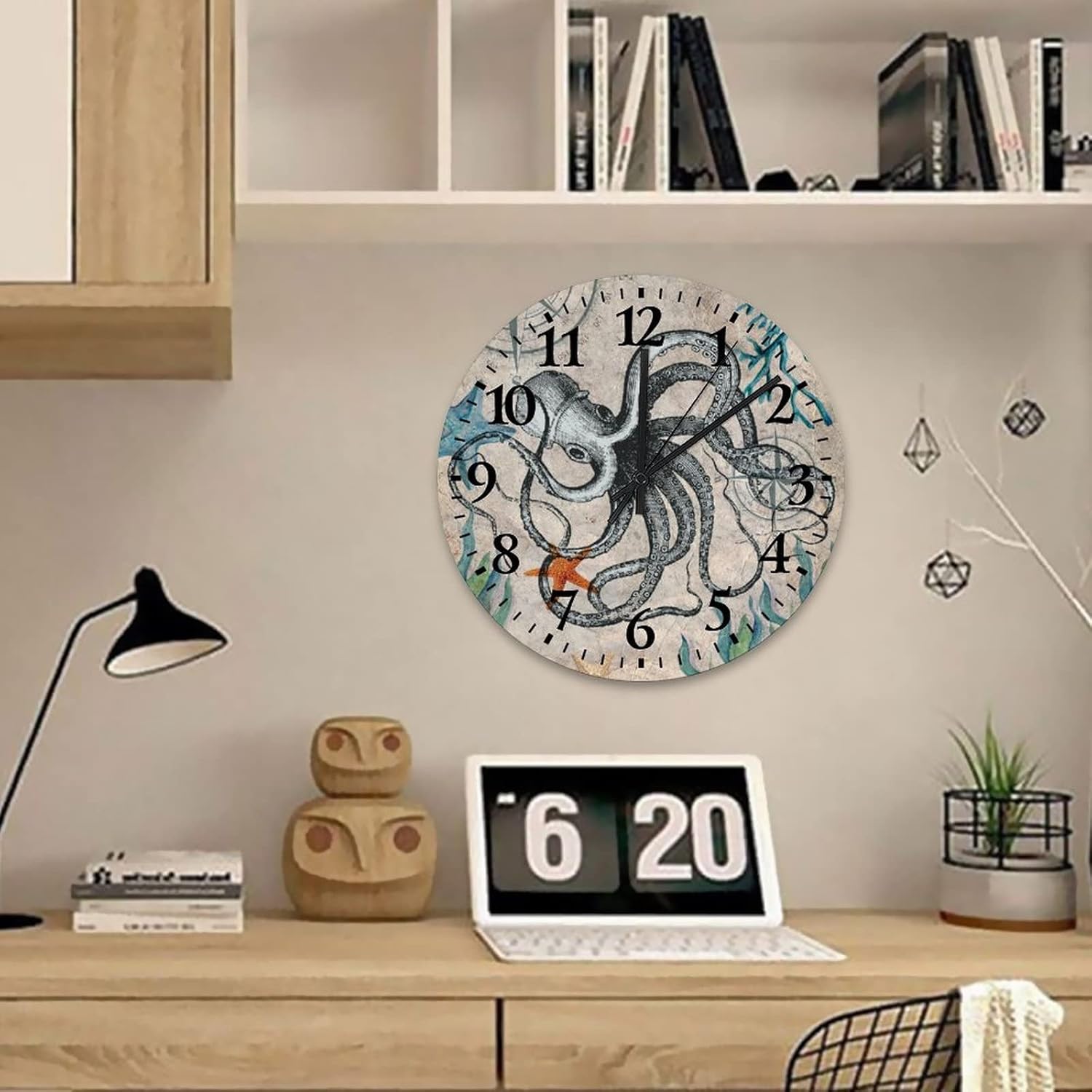 Ocean Animal Octopus wooden clocks Rustic Coastal Art living room clock Silent & Non-Ticking Arabic Numeral Clock Living Room Bedroom Kitchen Farmhouse Decor 15 Inch??Details:Product Size: 10/12/15 inches, (25/30/38 cm)Shape:RoundMaterial: Wood??Functional Home DécorThis Nautical Themed clock aren't just for timekeeping. They function as beautiful wall decor pieces, beyond telling time, and bring both style and purpose to any room.A charming home decoration, very suitable as a housewarming gift, making the home more warm. Suitable for any room, you can put it in any room such as home, living room, master bedroom, kitchen, bathroom, home office, etc. Elegant, durable and stylish.??Clock Hands Troubleshooting Guide:Check that the battery is a new battery and not a used battery.Make sure the hour and minute hands are not crossing or touching each other. If they are, adjust the hands by slightly bending them.See if the center pin that holds the hands together is firmly pushed in or screwed on, depending on the style.If hands are still not moving after the above, please reference the hands replacement instructions included with all of our open face clocks.