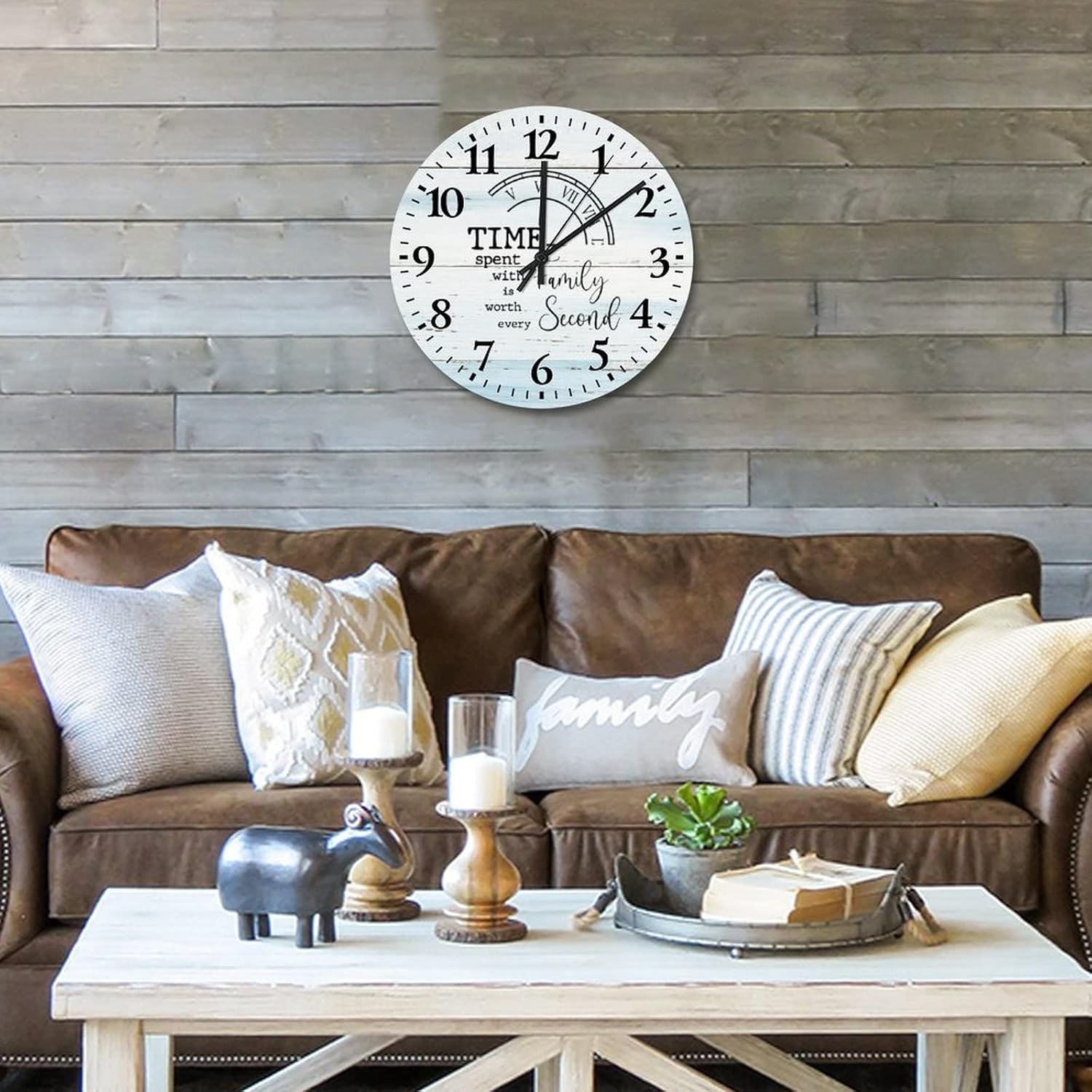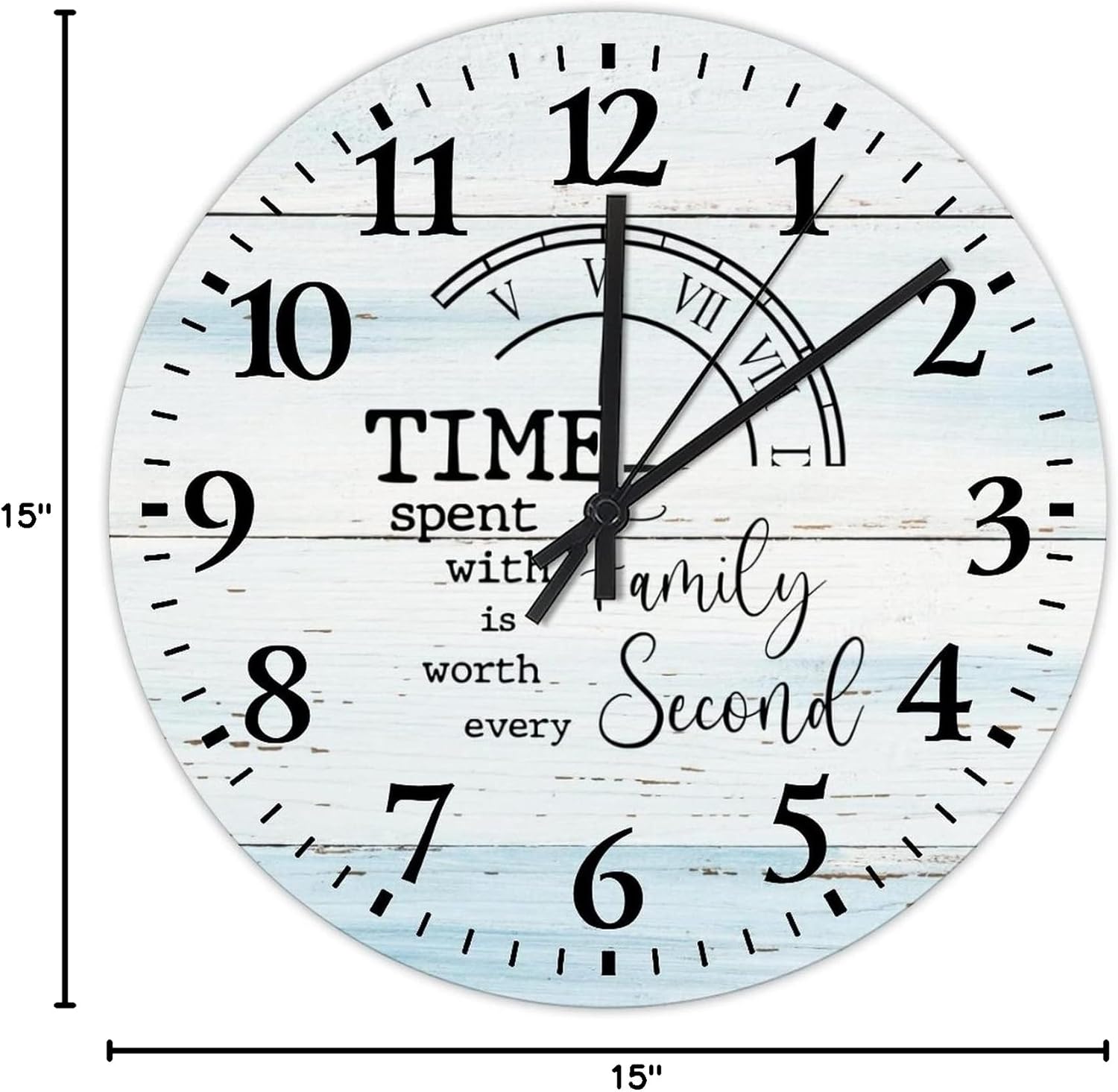 Time Spent with Family Is Worth Every Second Wood Clock Family Letter Quote wall clock wood Battery Operated Silent Arabic Numeral Clock Bathroom Kitchen Living Room Bedroom 15 InchDetails:Product Size: 10/12/15 inches, (25/30/38 cm)Shape:RoundMaterial: WoodFunctional Home DécorThis Family Quote Saying clock aren't just for timekeeping. They function as beautiful wall decor pieces, beyond telling time, and bring both style and purpose to any room.A charming home decoration, very suitable as a housewarming gift, making the home more warm. Suitable for any room, you can put it in any room such as home, living room, master bedroom, kitchen, bathroom, home office. Elegant, durable and stylish.Clock Hands Troubleshooting Guide:Check that the battery is a new battery and not a used battery.Make sure the hour and minute hands are not crossing or touching each other. If they are, adjust the hands by slightly bending them.See if the center pin that holds the hands together is firmly pushed in or screwed on, depending on the style.If hands are still not moving after the above, please reference the hands replacement instructions included with all of our open face clocks.